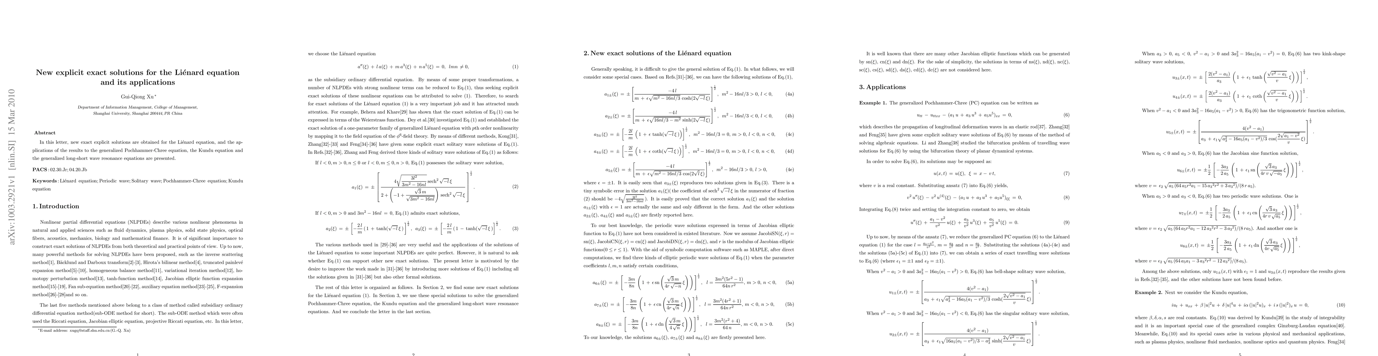 In this letter, new exact explicit solutions are obtained for the Li\'enard equation, and the applications of the results to the generalized Pochhammer-Chree equation, the Kundu equation and the generalized long-short wave resonance equations are presented.