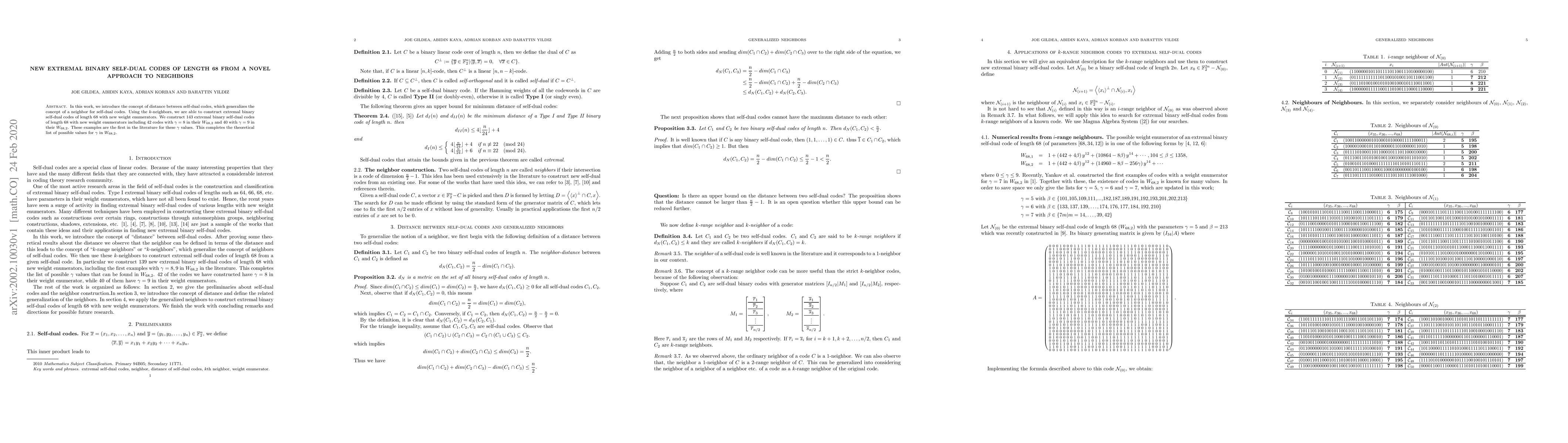 In this work, we introduce the concept of distance between self-dual codes, which generalizes the concept of a neighbor for self-dual codes. Using the k-neighbors, we are able to construct extremal binary self-dual codes of length 68 with new weight enumerators. We construct 143 extremal binary self-dual codes of length 68 with new weight enumerators including 42 codes with gamma=8 in their W_{68,2} and 40 with gamma=9 in their W_{68,2}. These examples are the first in the literature for these gamma values. This completes the theoretical list of possible values for gamma in W_{68,2}.