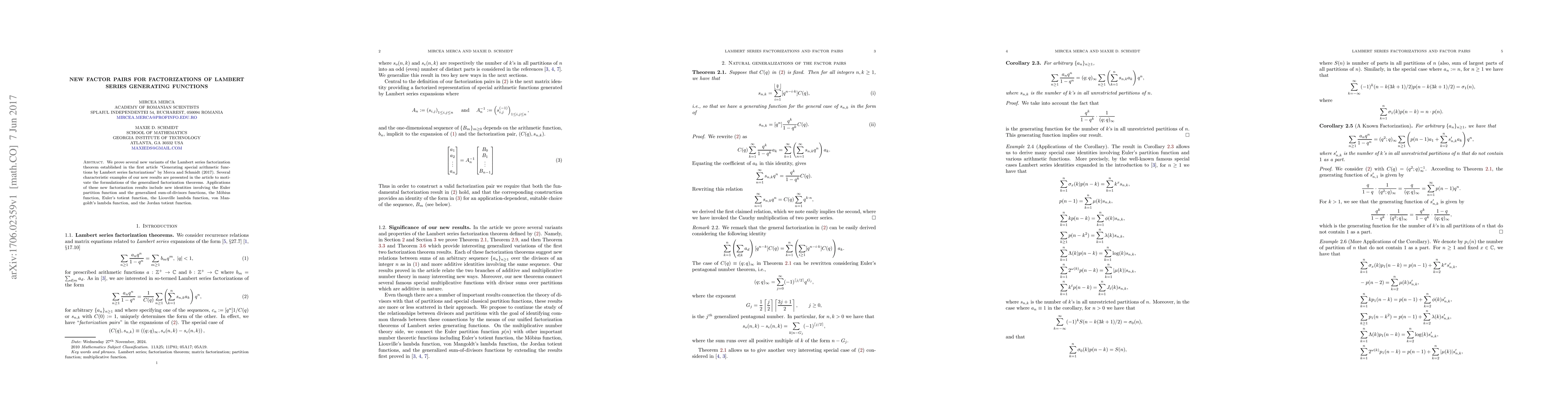 This paper presents new variants of the Lambert series factorization theorem, extending previous results from Merca and Schmidt (2017). It introduces generalized factorization theorems with applications to various arithmetic functions, including Euler's partition function, the M\"obius function, and the Liouville lambda function.