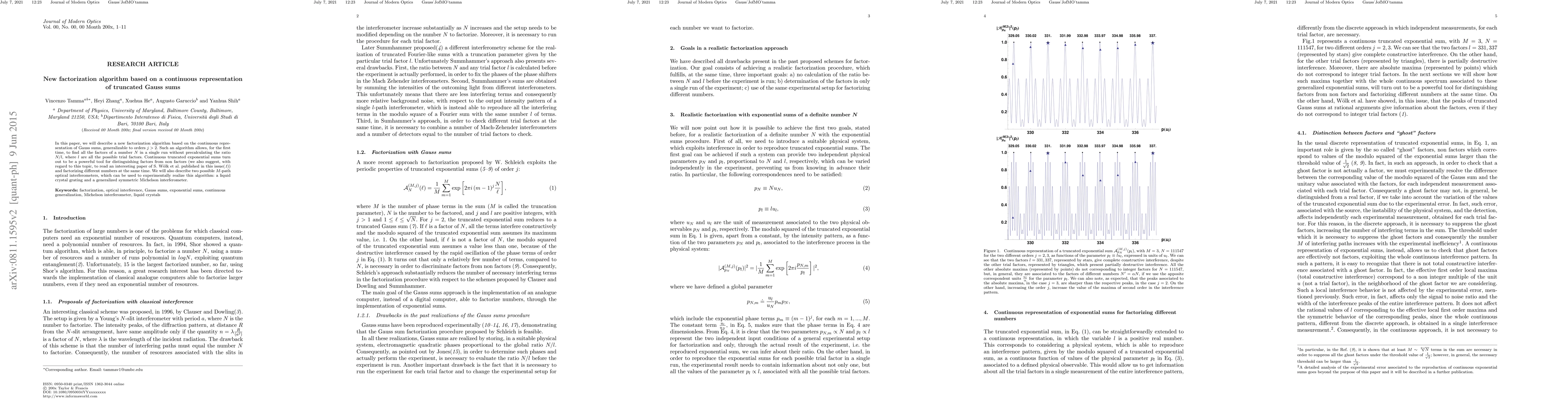 In this paper, we will describe a new factorization algorithm based on the continuous representation of Gauss sums, generalizable to orders j>2. Such an algorithm allows one, for the first time, to find all the factors of a number N in a single run without precalculating the ratio N/l, where l are all the possible trial factors. Continuous truncated exponential sums turn out to be a powerful tool for distinguishing factors from non-factors (we also suggest, with regard to this topic, to read an interesting paper by S. Woelk et al. also published in this issue [Woelk, Feiler, Schleich, J. Mod. Opt. in press]) and factorizing different numbers at the same time. We will also describe two possible M-path optical interferometers, which can be used to experimentally realize this algorithm: a liquid crystal grating and a generalized symmetric Michelson interferometer.