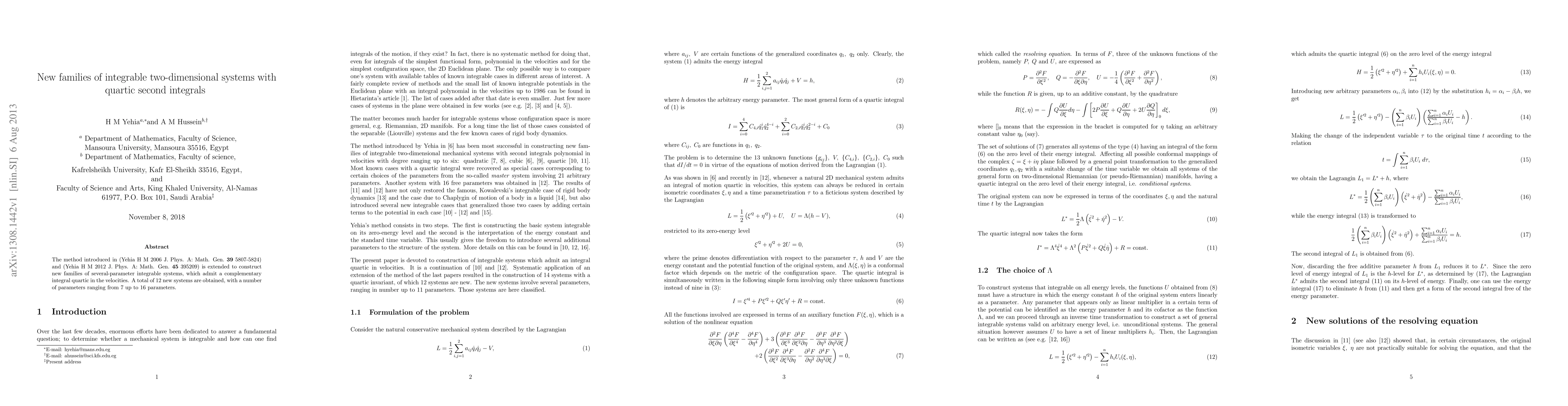 The method introduced in (Yehia H M 2006 J. Phys. A: Math. Gen. 39 5807-5824) and (Yehia H M 2012 J. Phys. A: Math. Gen. 45 395209) is extended to construct new families of several-parameter integrable systems, which admit a complementary integral quartic in the velocities. A total of 12 new systems are obtained, with a number of parameters ranging from 7 up to 16 parameters.