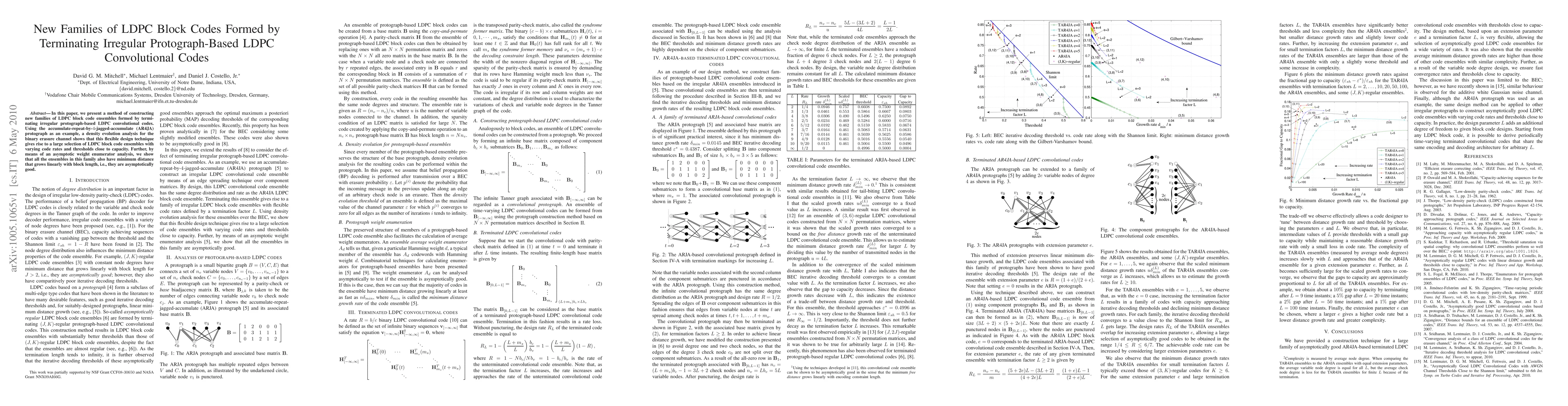 This paper introduces a method to create new LDPC block code families by terminating irregular protograph-based LDPC convolutional codes, exemplified by the AR4JA protograph. Density evolution analysis indicates these codes achieve high performance near capacity, while asymptotic weight enumerator analysis confirms their linear minimum distance growth.