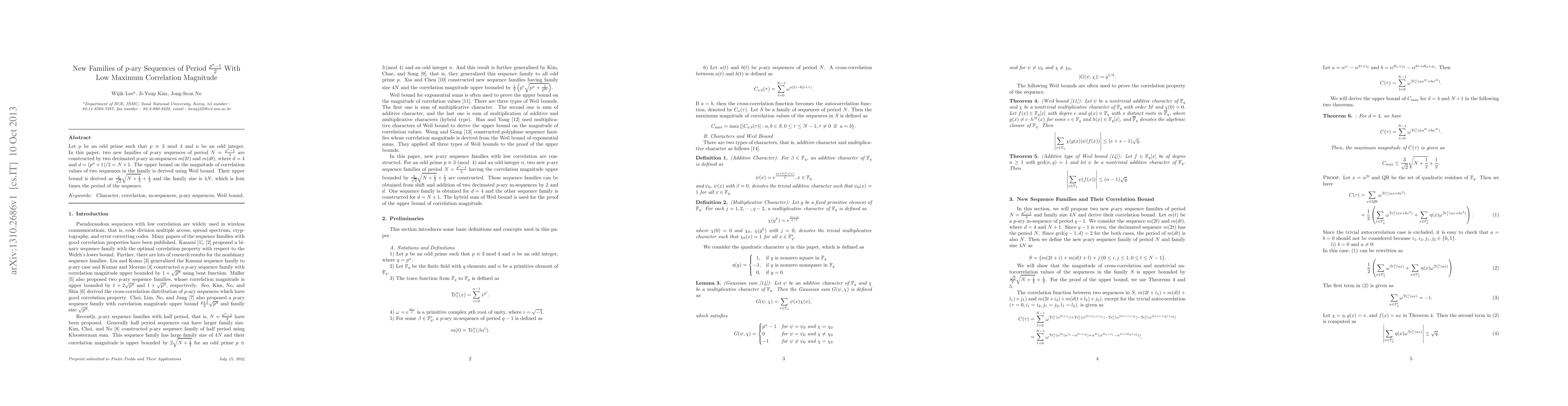 Let $p$ be an odd prime such that $p \equiv 3\;{\rm mod}\;4$ and $n$ be an odd integer. In this paper, two new families of $p$-ary sequences of period $N = \frac{p^n-1}{2}$ are constructed by two decimated $p$-ary m-sequences $m(2t)$ and $m(dt)$, where $d = 4$ and $d = (p^n + 1)/2=N+1$. The upper bound on the magnitude of correlation values of two sequences in the family is derived using Weil bound. Their upper bound is derived as $\frac{3}{\sqrt{2}} \sqrt{N+\frac{1}{2}}+\frac{1}{2}$ and the family size is 4N, which is four times the period of the sequence.