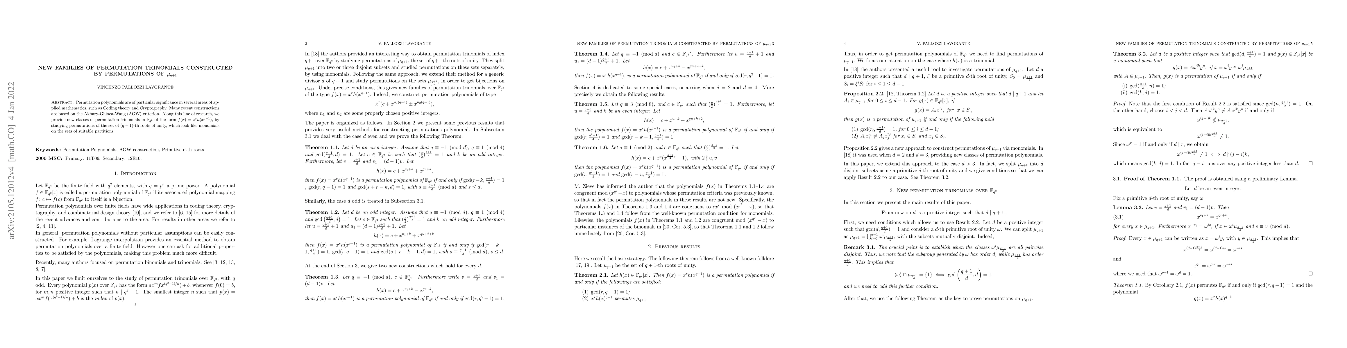 Permutation polynomials are of particular significance in several areas of applied mathematics, such as Coding theory and Cryptography. Many recent constructions are based on the Akbary-Ghioca-Wang (AGW) criterion. Along this line of research, we provide new classes of permutation trinomials in $\mathbb{F}_{q^2}$ of the form $f(x)=x^r h(x^{q-1})$, by studying permutations of the set of $(q+1)$-th roots of unity, which look like monomials on the sets of suitable partitions.