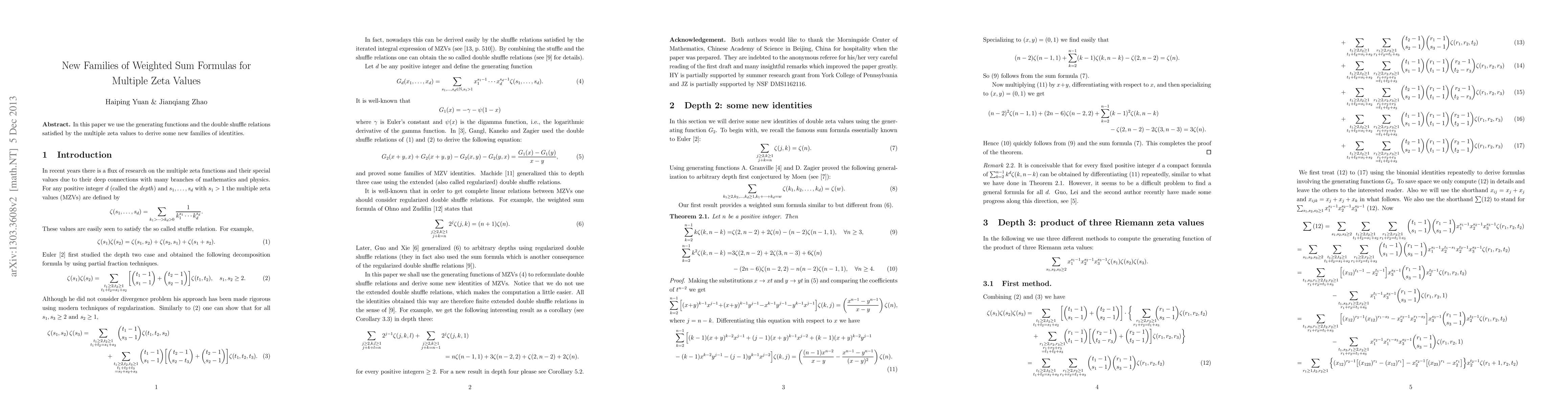 Researchers derived new families of weighted sum formulas for multiple zeta values using generating functions and double shuffle relations, expanding our understanding of these mathematical identities.