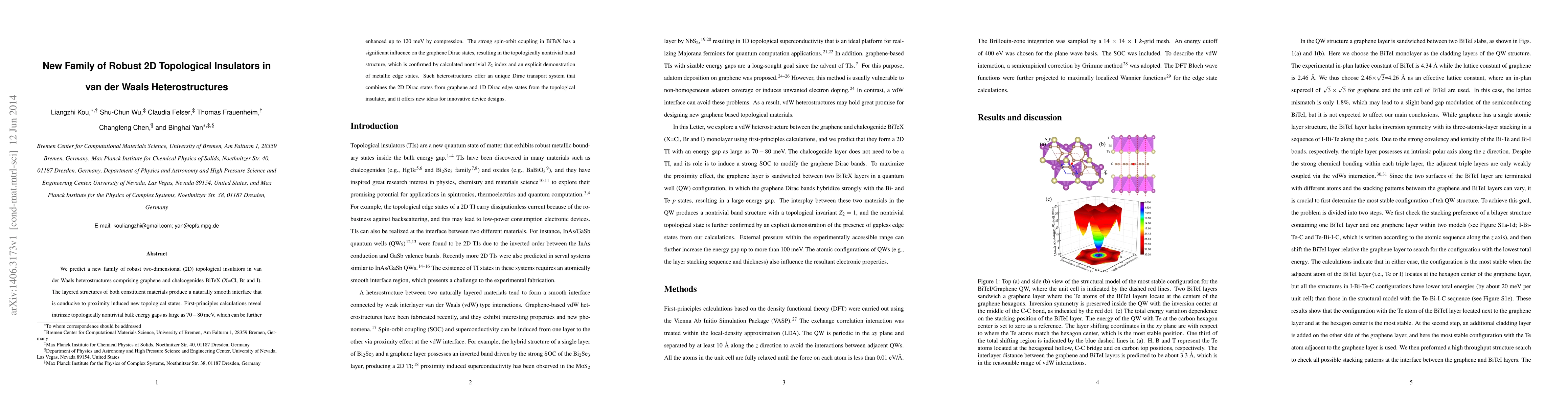 The paper predicts a new family of robust 2D topological insulators in van der Waals heterostructures made from graphene and BiTeX (X=Cl, Br, I), exhibiting large intrinsic topologically nontrivial bulk energy gaps up to 120 meV under compression. The heterostructures display metallic edge states and a unique Dirac transport system combining graphene's 2D Dirac states with topological insulator's 1D edge states.