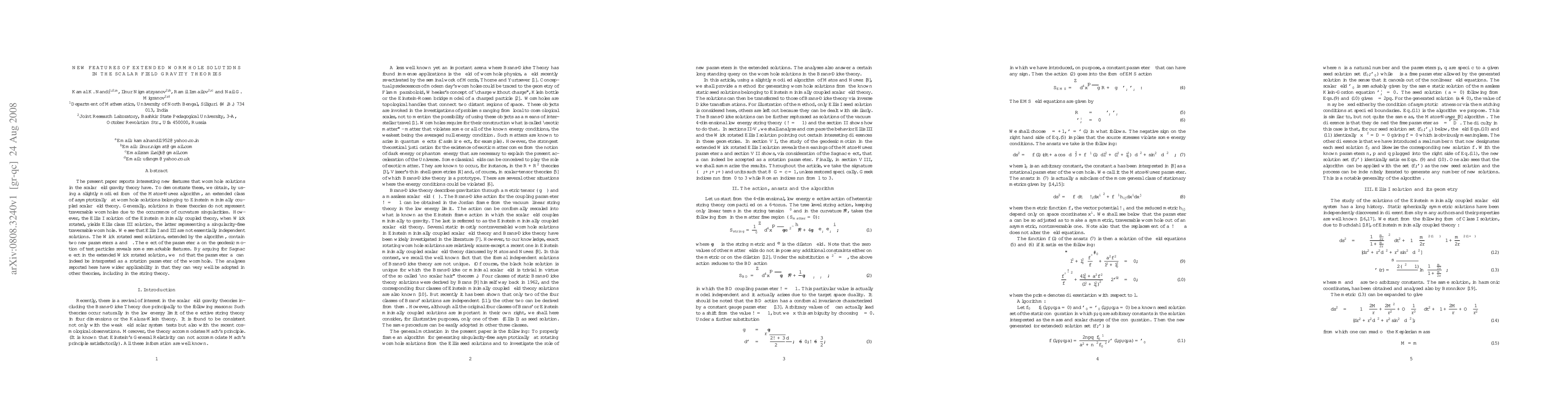 The present paper reports interesting new features that wormhole solutions in the scalar field gravity theory have. To demonstrate these, we obtain, by using a slightly modified form of the Matos-Nunez algorithm, an extended class of asymptotically flat wormhole solutions belonging to Einstein minimally coupled scalar field theory. Generally, solutions in these theories do not represent traversable wormholes due to the occurrence of curvature singularities. However, the Ellis I solution of the Einstein minimally coupled theory, when Wick rotated, yields Ellis class III solution, the latter representing a singularity-free traversable wormhole. We see that Ellis I and III are not essentially independent solutions. The Wick rotated seed solutions, extended by the algorithm, contain two new parameters a and \delta;. The effect of the parameter a on the geodesic motion of test particles reveals some remarkable features. By arguing for Sagnac effect in the extended Wick rotated solution, we find that the parameter a can indeed be interpreted as a rotation parameter of the wormhole. The analyses reported here have wider applicability in that they can very well be adopted in other theories, including in the string theory.