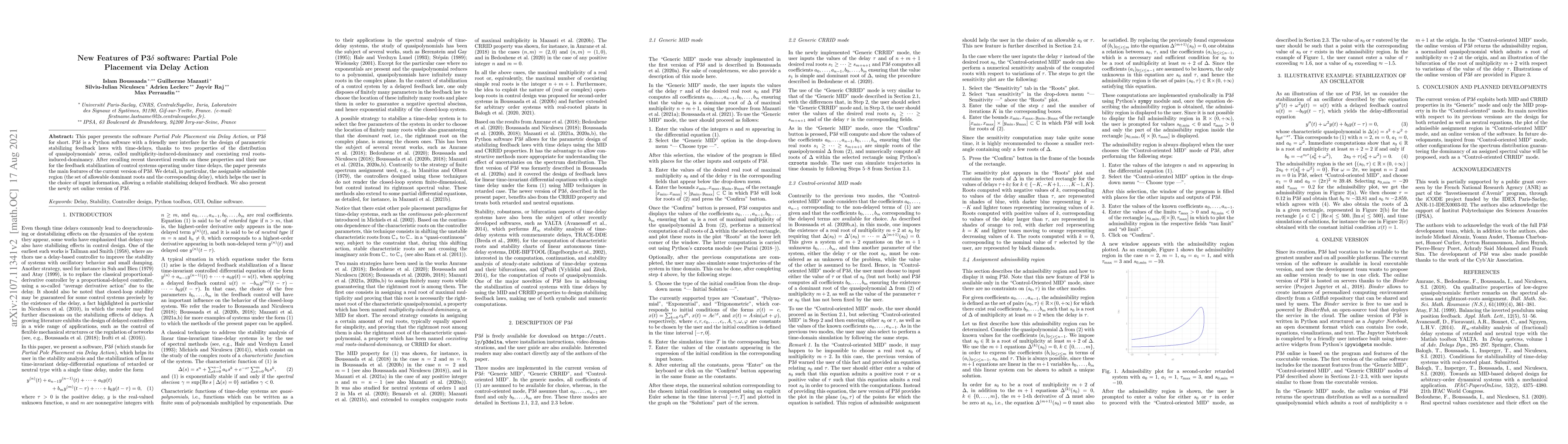This paper presents the software Partial Pole Placement via Delay Action, or P3$\delta$ for short. P3$\delta$ is a Python software with a friendly user interface for the design of parametric stabilizing feedback laws with time-delays, thanks to two properties of the distribution of quasipolynomials' zeros, called multiplicity-induced-dominancy and coexisting real roots-induced-dominancy. After recalling recent theoretical results on these properties and their use for the feedback stabilization of control systems operating under time delays, the paper presents the main features of the current version of P3$\delta$. We detail, in particular, the assignable admissible region (the set of allowable dominant roots and the corresponding delay), which helps the user in the choice of input information, allowing a reliable stabilizing delayed feedback. We also present the newly set online version of P3$\delta$.