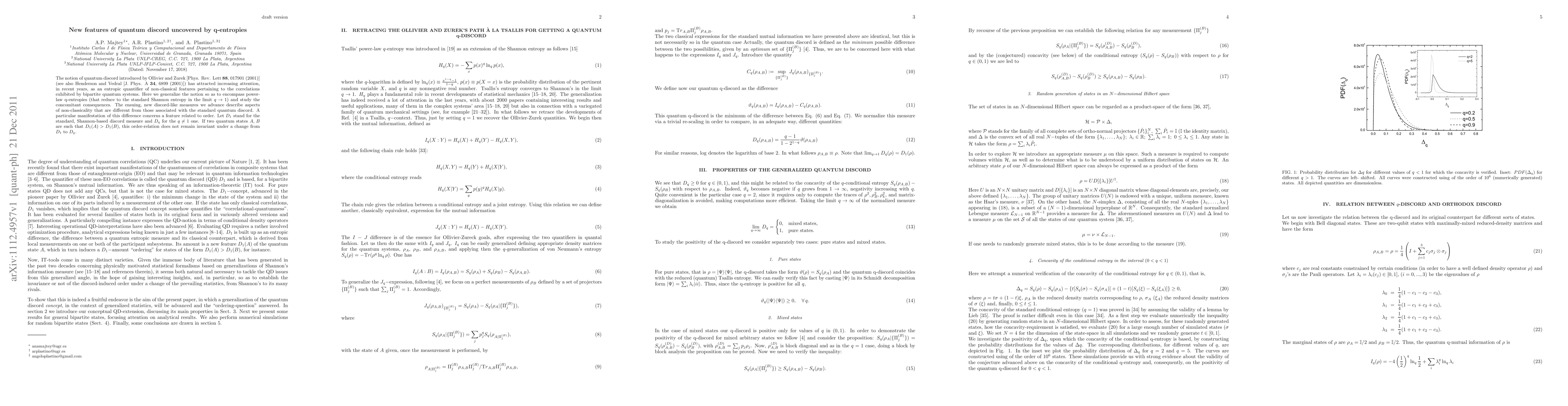 The notion of quantum discord introduced by Ollivier and Zurek [Phys. Rev. Lett 88, 017901 (2001)] (see also Henderson and Vedral [J. Phys. A 34, 6899 (2001)]) has attracted increasing attention, in recent years, as an entropic quantifier of non-classical features pertaining to the correlations exhibited by bipartite quantum systems. Here we generalize the notion so as to encompass power-law q-entropies (that reduce to the standard Shannon entropy in the limit $q \to 1$) and study the concomitant consequences. The ensuing, new discord-like measures we advance describe aspects of non-classicality that are different from those associated with the standard quantum discord. A particular manifestation of this difference concerns a feature related to order. Let $D_1$ stand for the standard, Shannon-based discord measure and $D_q$ for the $q \ne 1$ one. If two quantum states $A$, $B$ are such that $D_1(A) > D_1(B)$, this order-relation does not remain invariant under a change from $D_1$ to $D_q$.