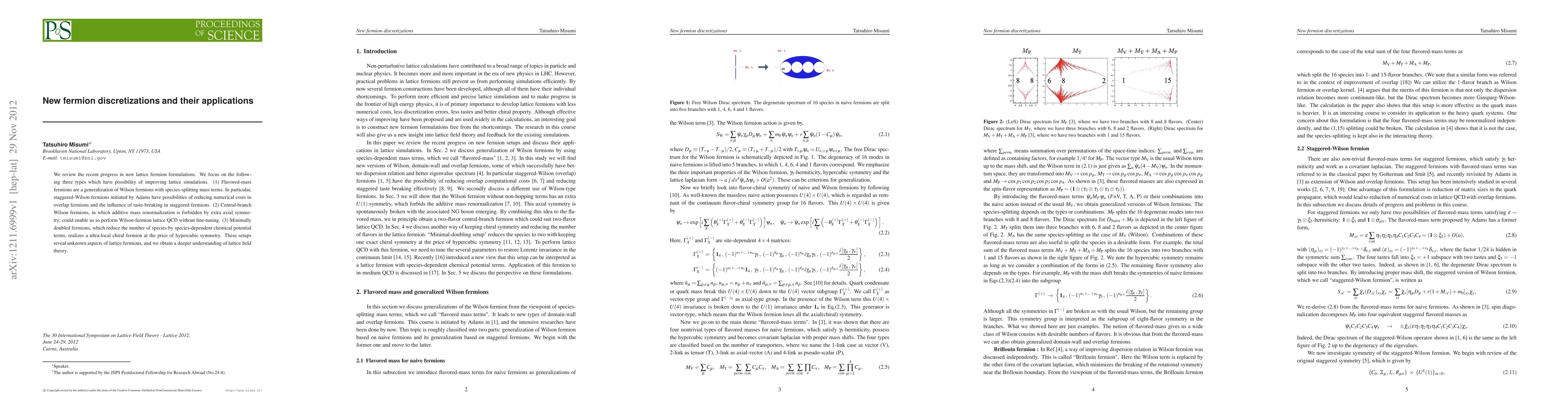 We review the recent progress in new lattice fermion formulations. We focus on the following three types which have possibility of improving lattice simulations. (1) Flavored-mass fermions are a generalization of Wilson fermions with species-splitting mass terms. In particular, staggered-Wilson fermions initiated by Adams have possibilities of reducing numerical costs in overlap fermions and the influence of taste-breaking in staggered fermions. (2) Central-branch Wilson fermions, in which additive mass renormalization is forbidden by extra axial symmetry, could enable us to perform Wilson-fermion lattice QCD without fine-tuning. (3) Minimally doubled fermions, which reduce the number of species by species-dependent chemical potential terms, realizes a ultra-local chiral fermion at the price of hypercubic symmetry. These setups reveal unknown aspects of lattice fermions, and we obtain a deeper understanding of lattice field theory.