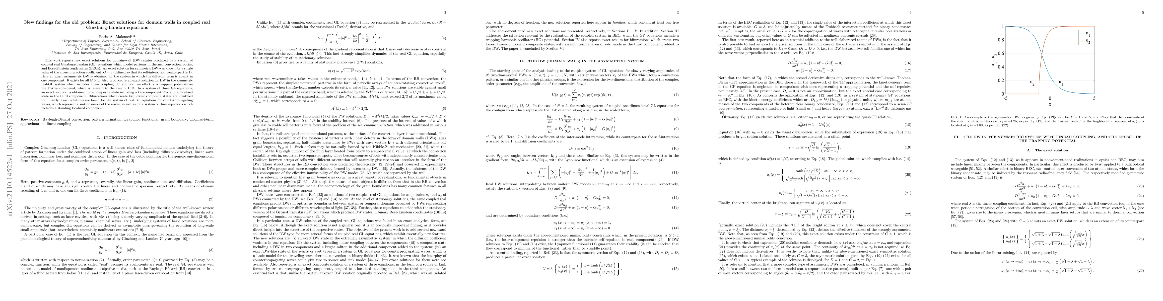 This work reports new exact solutions for domain-wall (DW) states produced by a system of coupled real Ginzburg-Landau (GL) equations which model patterns in thermal convection, optics, and Bose-Einstein condensates (BECs). An exact solution for symmetric DW was known for a single value of the cross-interaction coefficient, G = 3 (defined so that its self-interaction counterpart is 1). Here an exact asymmetric DW is obtained for the system in which the diffusion term is absent in one component. It exists for all G > 1. Also produced is an exact solution for DW in the symmetric real-GL system which includes linear coupling. In addition, an effect of a trapping potential on the DW is considered, which is relevant to the case of BEC. In a system of three GL equations, an exact solution is obtained for a composite state including a two-component DW and a localized state in the third component. Bifurcations which create two lowest composite states are identified too. Lastly, exact solutions are found for the system of real GL equations for counterpropagating waves, which represent a sink or source of the waves, as well as for a system of three equations which includes a standing localized component.