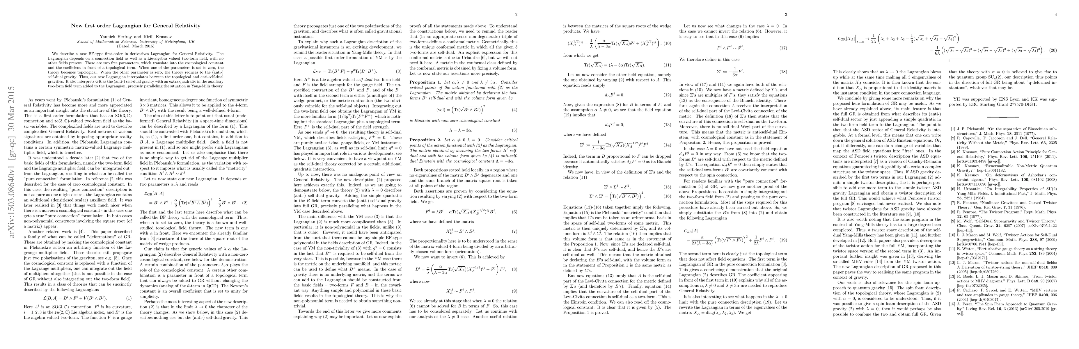 This research introduces a novel first-order Lagrangian for General Relativity, incorporating a connection field and a Lie-algebra valued two-form field. It features two free parameters, enabling interpolation between topological gravity and anti-self-dual gravity, while also presenting GR as self-dual gravity with an additional quadratic term in the auxiliary field, akin to Yang-Mills theory.