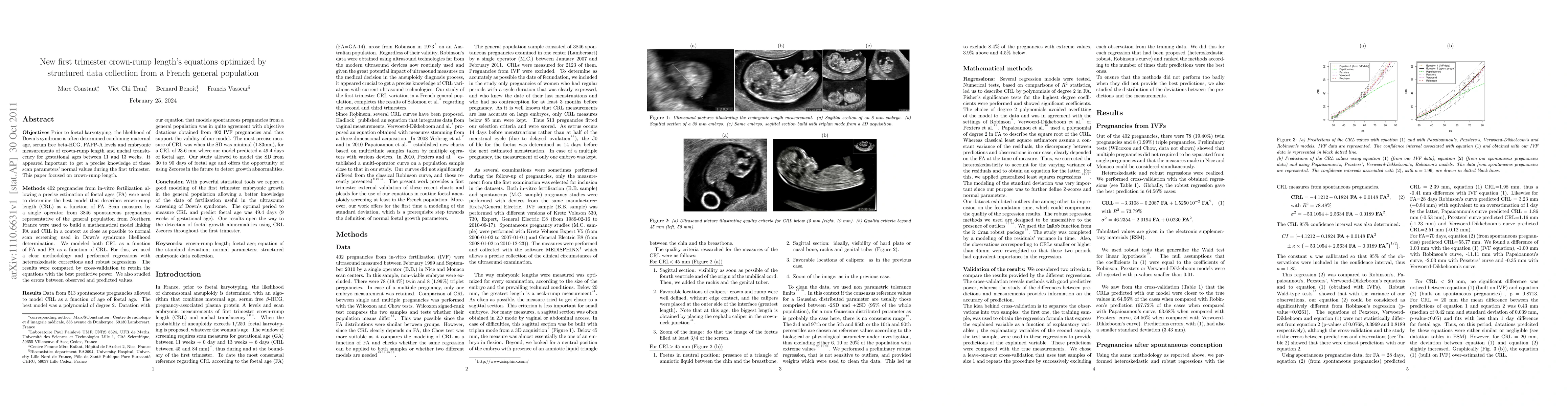--- Objectives --- Prior to foetal karyotyping, the likelihood of Down's syndrome is often determined combining maternal age, serum free beta-HCG, PAPP-A levels and embryonic measurements of crown-rump length and nuchal translucency for gestational ages between 11 and 13 weeks. It appeared important to get a precise knowledge of these scan parameters' normal values during the first trimester. This paper focused on crown-rump length. --- METHODS --- 402 pregnancies from in-vitro fertilization allowing a precise estimation of foetal ages (FA) were used to determine the best model that describes crown-rump length (CRL) as a function of FA. Scan measures by a single operator from 3846 spontaneous pregnancies representative of the general population from Northern France were used to build a mathematical model linking FA and CRL in a context as close as possible to normal scan screening used in Down's syndrome likelihood determination. We modeled both CRL as a function of FA and FA as a function of CRL. For this, we used a clear methodology and performed regressions with heteroskedastic corrections and robust regressions. The results were compared by cross-validation to retain the equations with the best predictive power. We also studied the errors between observed and predicted values. --- Results --- Data from 513 spontaneous pregnancies allowed to model CRL as a function of age of foetal age. The best model was a polynomial of degree 2. Datation with our equation that models spontaneous pregnancies from a general population was in quite agreement with objective datations obtained from 402 IVF pregnancies and thus support the validity of our model. The most precise measure of CRL was when the SD was minimal (1.83mm), for a CRL of 23.6 mm where our model predicted a 49.4 days of foetal age. Our study allowed to model the SD from 30 to 90 days of foetal age and offers the opportunity of using Zscores in the future to detect growth abnormalities. --- Conclusion --- With powerful statistical tools we report a good modeling of the first trimester embryonic growth in the general population allowing a better knowledge of the date of fertilization useful in the ultrasound screening of Down's syndrome. The optimal period to measure CRL and predict foetal age was 49.4 days (9 weeks of gestational age). Our results open the way to the detection of foetal growth abnormalities using CRL Zscores throughout the first trimester.