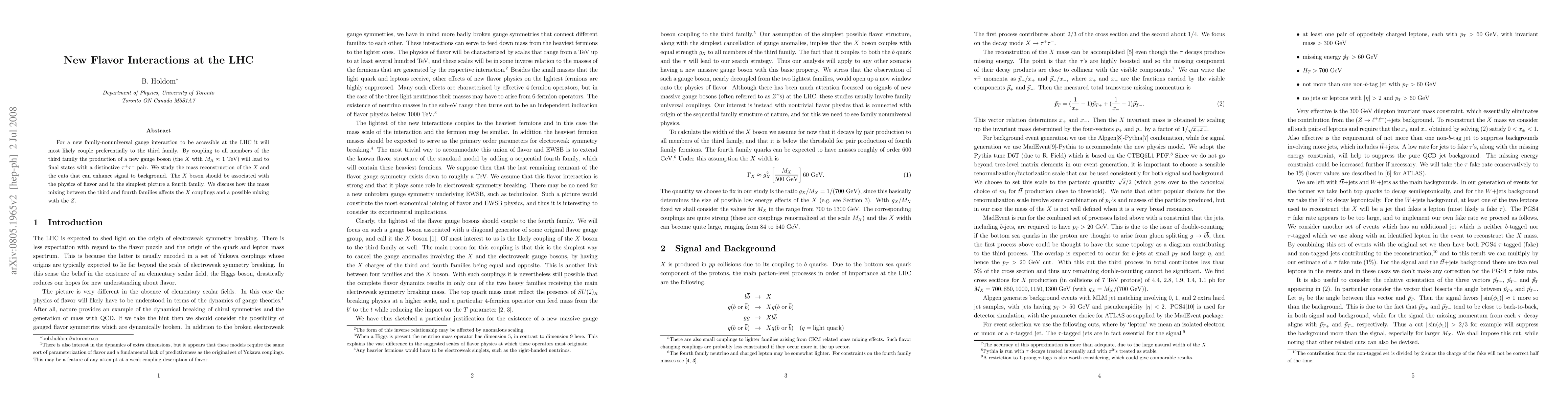 For a new family-nonuniversal gauge interaction to be accessible at the LHC it will most likely couple preferentially to the third family. By coupling to all members of the third family the production of a new gauge boson (the $X$ with $M_X\approx1$ TeV) will lead to final states with a distinctive $\tau^+\tau^-$ pair. We study the mass reconstruction of the $X$ and the cuts that can enhance signal to background. The $X$ boson should be associated with the physics of flavor and in the simplest picture a fourth family. We discuss how the mass mixing between the third and fourth families affects the $X$ couplings and a possible mixing with the $Z$.