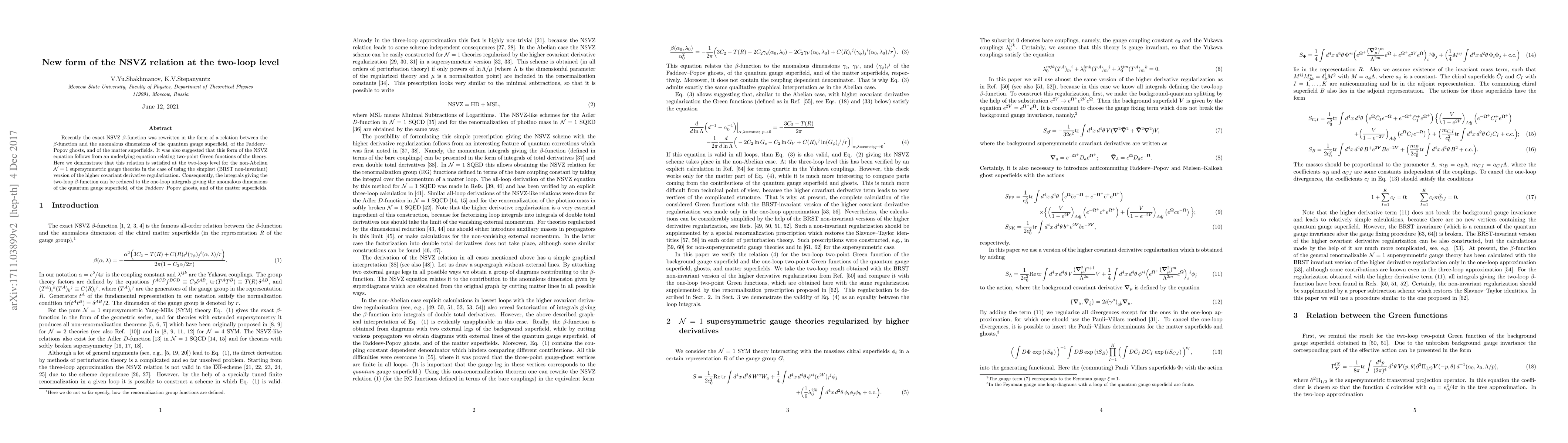 Recently the exact NSVZ $\beta$-function was rewritten in the form of a relation between the $\beta$-function and the anomalous dimensions of the quantum gauge superfield, of the Faddeev--Popov ghosts, and of the matter superfields. It was also suggested that this form of the NSVZ equation follows from an underlying equation relating two-point Green functions of the theory. Here we demonstrate that this relation is satisfied at the two-loop level for the non-Abelian ${\cal N}=1$ supersymmetric gauge theories in the case of using the simplest (BRST non-invariant) version of the higher covariant derivative regularization. Consequently, the integrals giving the two-loop $\beta$-function can be reduced to the one-loop integrals giving the anomalous dimensions of the quantum gauge superfield, of the Faddeev--Popov ghosts, and of the matter superfields.