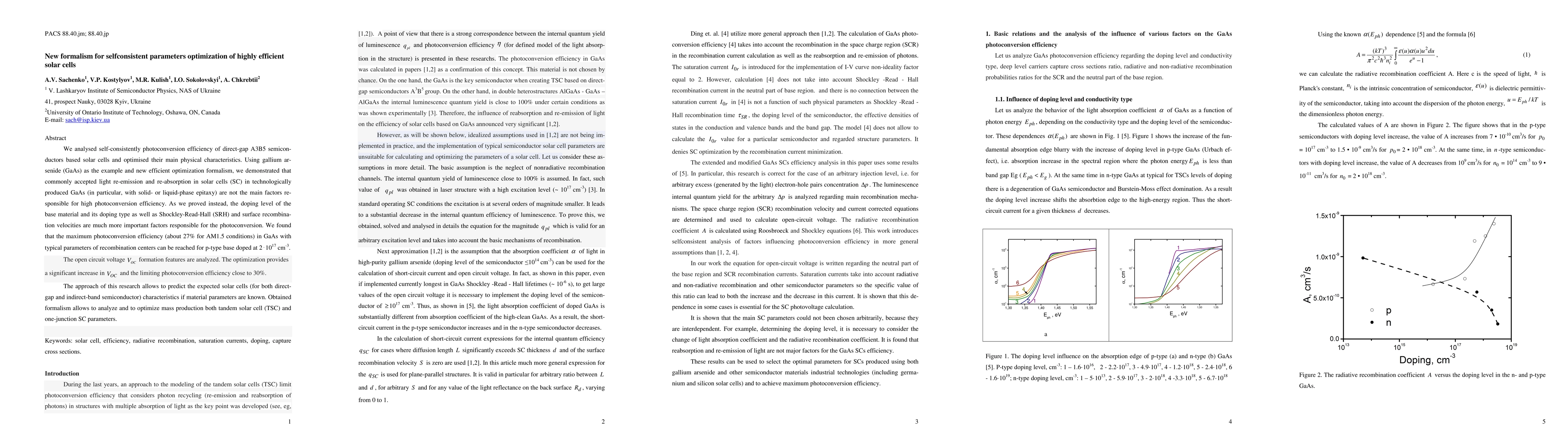 We analysed self-consistently photoconversion efficiency of direct-gap A3B5 semicon-ductors based solar cells and optimised their main physical characteristics. Using gallium ar-senide (GaAs) as the example and new efficient optimization formalism, we demonstrated that commonly accepted light re-emission and re-absorption in solar cells (SC) in technologically produced GaAs (in particular, with solid- or liquid-phase epitaxy) are not the main factors re-sponsible for high photoconversion efficiency. As we proved instead, the doping level of the base material and its doping type as well as Shockley-Read-Hall (SRH) and surface recombination velocities are much more important factors responsible for the photoconversion. We found that the maximum photoconversion efficiency (about 27% for AM1.5 conditions) in GaAs with typical parameters of recombination centers can be reached for p-type base doped at $2 \cdot 10^{17}$ cm$^{-3}$. The open circuit voltage $V_{OC}$ formation features are analyzed. The optimization provides a significant increase in $V_{OC}$ and the limiting photoconversion efficiency close to 30%. The approach of this research allows to predict the expected solar cells (for both direct-gap and indirect-band semiconductor) characteristics if material parameters are known. Obtained formalism allows to analyze and to optimize mass production both tandem solar cell (TSC) and one-junction SC parameters.