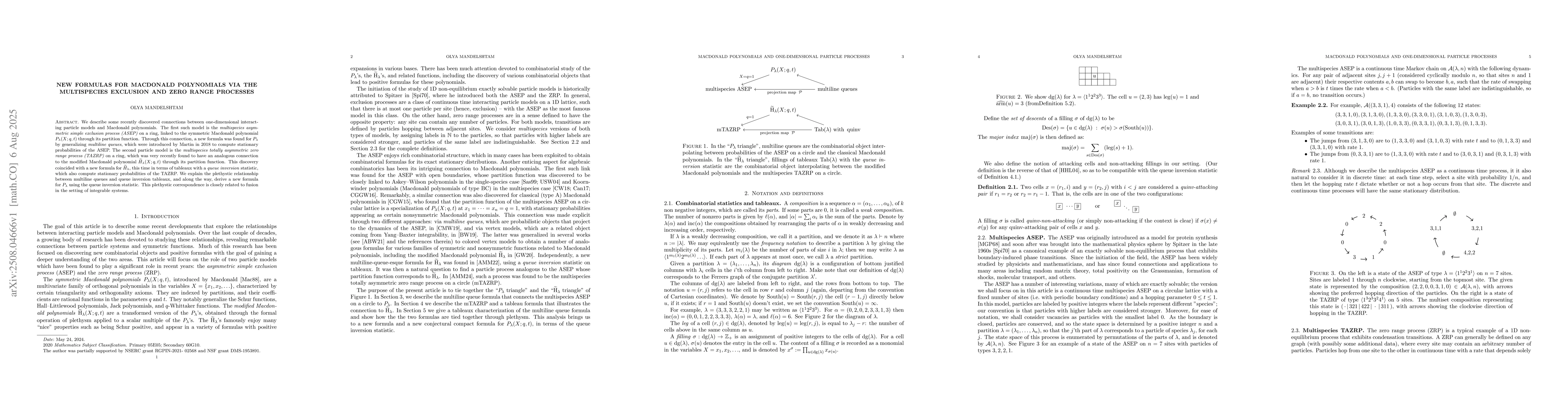 We describe some recently discovered connections between one-dimensional interacting particle models and Macdonald polynomials. The first such model is the multispecies asymmetric simple exclusion process (ASEP) on a ring, linked to the symmetric Macdonald polynomial $P_{\lambda}(X;q,t)$ through its partition function. Through this connection, a new formula was found for $P_{\lambda}$ by generalizing multiline queues, which were introduced by Martin in 2018 to compute stationary probabilities of the ASEP. The second particle model is the multispecies totally asymmetric zero range process (TAZRP) on a ring, which was very recently found to have an analogous connection to the modified Macdonald polynomial $\widetilde{H}_{\lambda}(X;q,t)$ through its partition function. This discovery coincided with a new formula for $\widetilde{H}_{\lambda}$, this time in terms of tableaux with a queue inversion statistic, which also compute stationary probabilities of the TAZRP. We explain the plethystic relationship between multiline queues and queue inversion tableaux, and along the way, derive a new formula for $P_{\lambda}$ using the queue inversion statistic. This plethystic correspondence is closely related to fusion in the setting of integrable systems.
