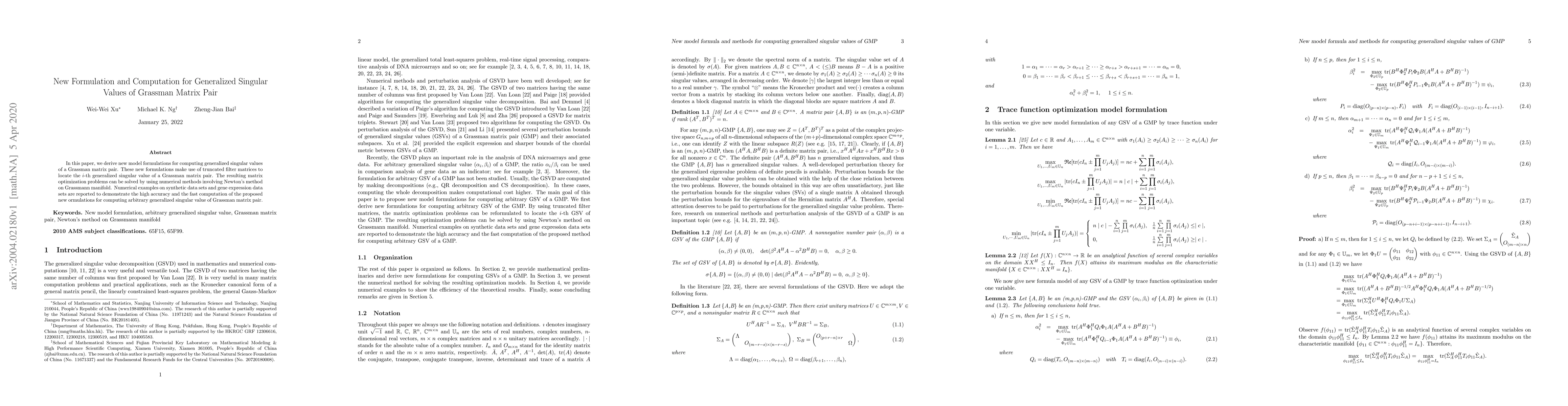 In this paper, we derive new model formulations for computing generalized singular values of a Grassman matrix pair. These new formulations make use of truncated filter matrices to locate the $i$-th generalized singular value of a Grassman matrix pair. The resulting matrix optimization problems can be solved by using numerical methods involving Newton's method on Grassmann manifold. Numerical examples on synthetic data sets and gene expression data sets are reported to demonstrate the high accuracy and the fast computation of the proposed new ormulations for computing arbitrary generalized singular value of Grassman matrix pair.