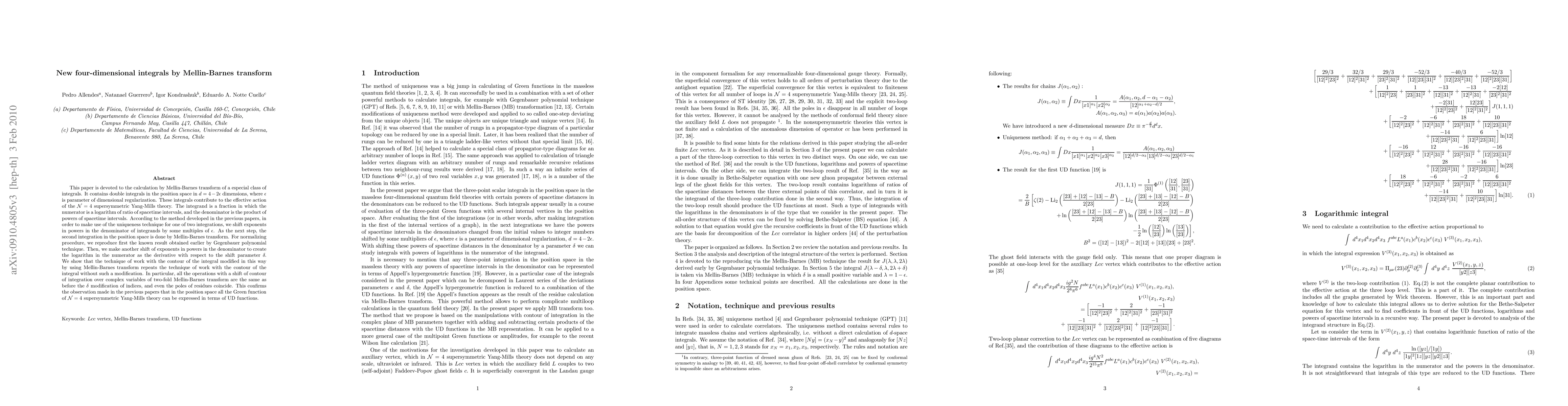 This paper uses the Mellin-Barnes transform to calculate a specific type of integral in 4-2e dimensions that contributes to the effective action of N = 4 supersymmetric Yang-Mills theory, confirming the role of UD functions in expressing Green functions.