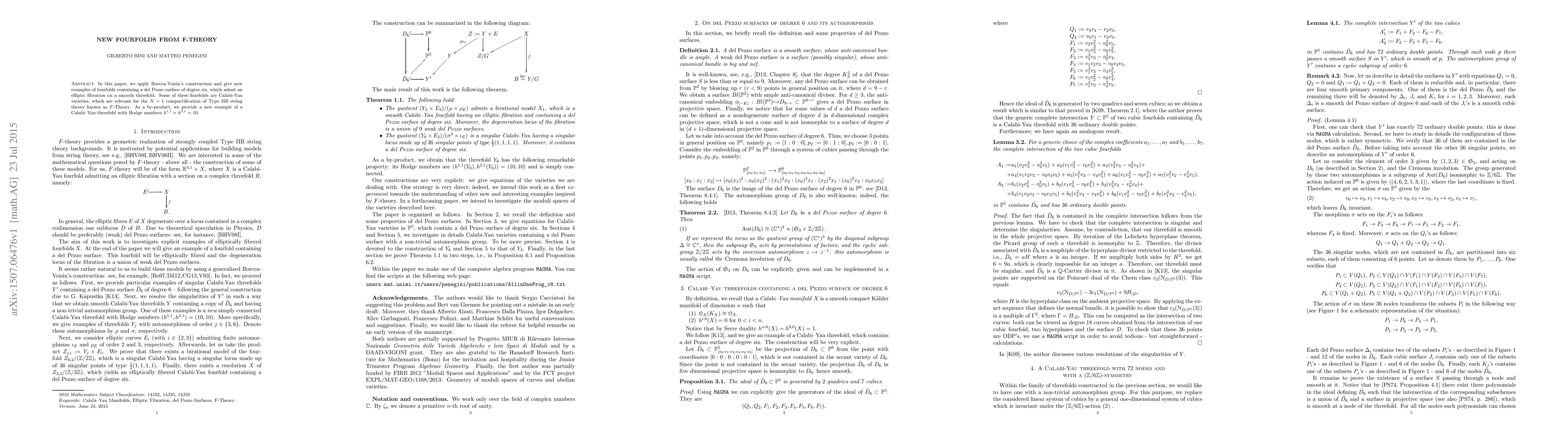 This paper constructs new fourfolds from F-Theory using Borcea-Voisin's method, featuring del Pezzo surfaces of degree six and elliptic fibrations. Some of these fourfolds are Calabi-Yau varieties significant for $N=1$ Type IIB string theory compactification. Additionally, it presents a new Calabi-Yau threefold with Hodge numbers $h^{1,1}=h^{2,1}=10$.