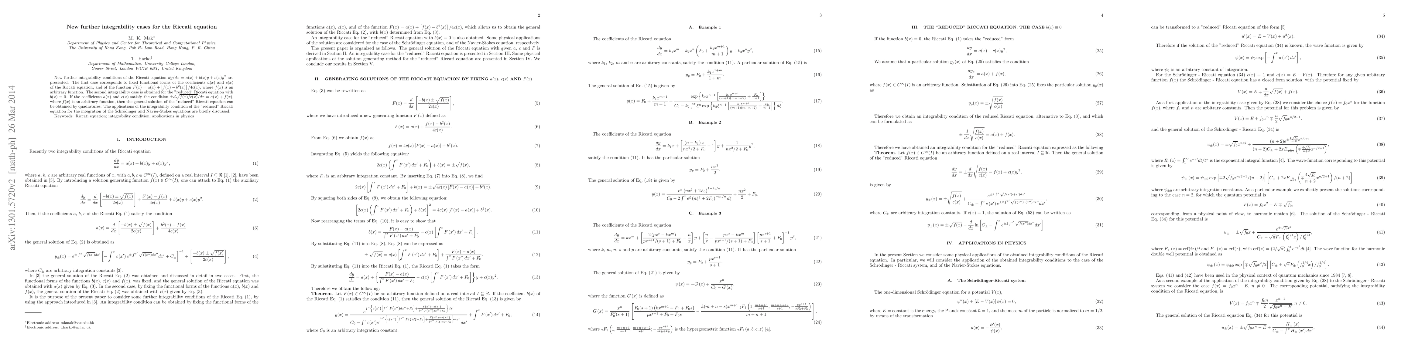 This paper presents new integrability conditions for the Riccati equation, including cases where fixed functional forms of coefficients allow for solutions, and a "reduced" Riccati equation with $b(x)\equiv 0$ that can be solved by quadratures under specific conditions. Applications to the Schrödinger and Navier-Stokes equations are briefly discussed.