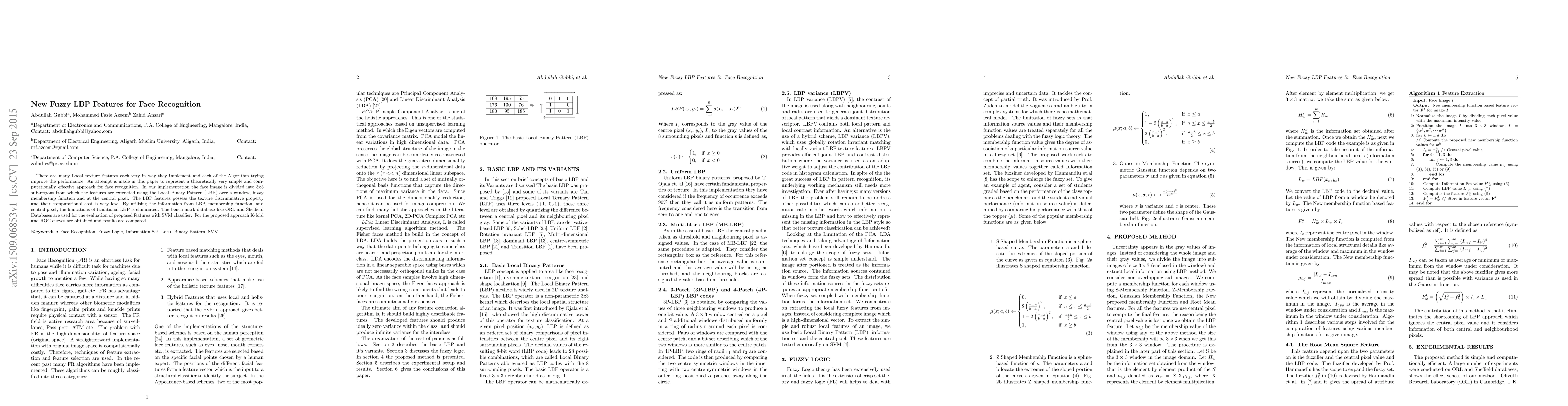There are many Local texture features each very in way they implement and each of the Algorithm trying improve the performance. An attempt is made in this paper to represent a theoretically very simple and computationally effective approach for face recognition. In our implementation the face image is divided into 3x3 sub-regions from which the features are extracted using the Local Binary Pattern (LBP) over a window, fuzzy membership function and at the central pixel. The LBP features possess the texture discriminative property and their computational cost is very low. By utilising the information from LBP, membership function, and central pixel, the limitations of traditional LBP is eliminated. The bench mark database like ORL and Sheffield Databases are used for the evaluation of proposed features with SVM classifier. For the proposed approach K-fold and ROC curves are obtained and results are compared.
