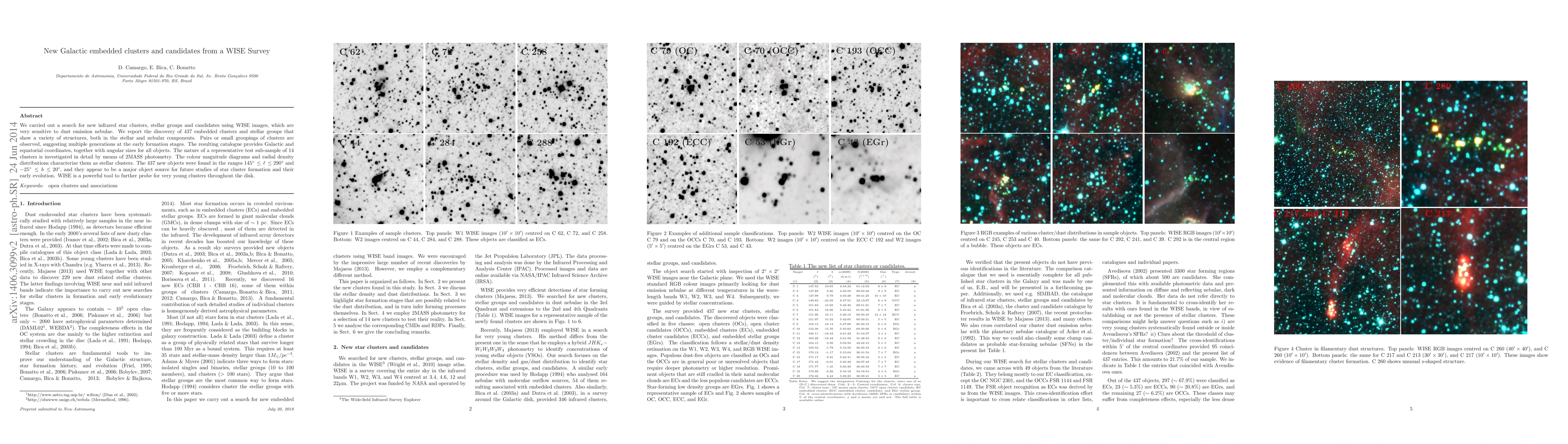 We carried out a search for new infrared star clusters, stellar groups and candidates using WISE images, which are very sensitive to dust emission nebulae. We report the discovery of 437 embedded clusters and stellar groups that show a variety of structures, both in the stellar and nebular components. Pairs or small groupings of clusters are observed, suggesting multiple generations at the early formation stages. The resulting catalogue provides Galactic and equatorial coordinates, together with angular sizes for all objects. The nature of a representative test sub-sample of 14 clusters is investigated in detail by means of 2MASS photometry. The colour magnitude diagrams and radial density distributions characterize them as stellar clusters. The 437 new objects were found in the ranges $145^\circ\,\leq\,\ell\,\leq 290^\circ$ and $-25^\circ\,\leq\,b\,\leq 20^\circ$, and they appear to be a major object source for future studies of star cluster formation and their early evolution. WISE is a powerful tool to further probe for very young clusters throughout the disk.