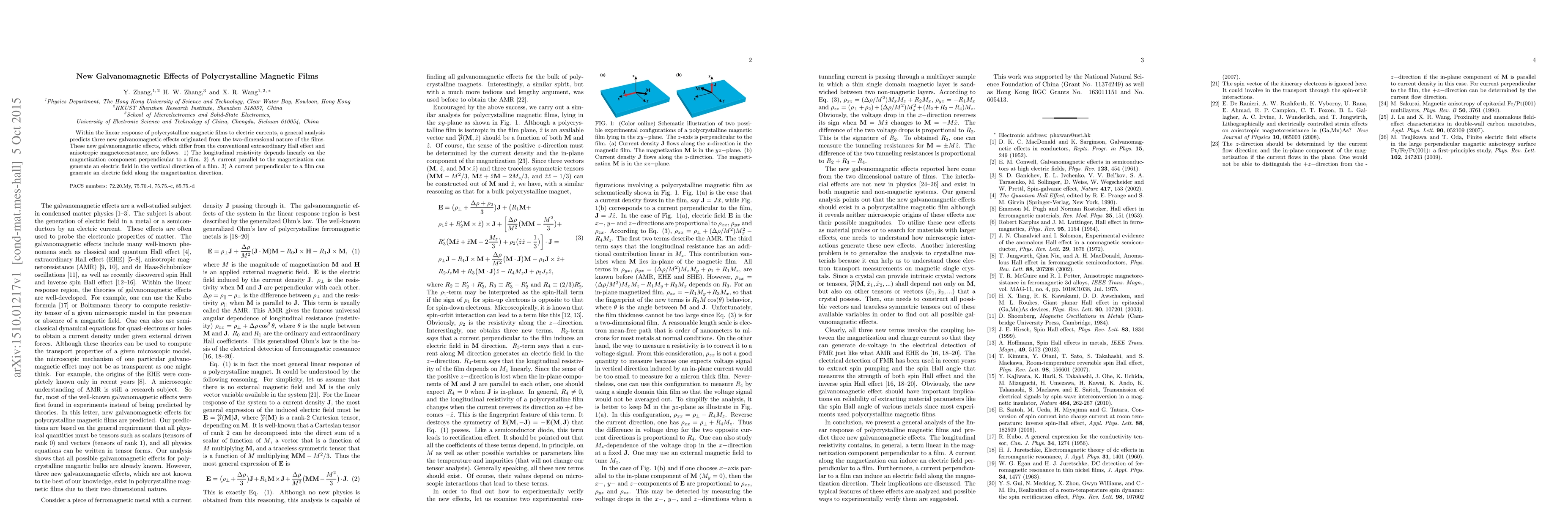 This paper identifies three new galvanomagnetic effects in polycrystalline magnetic films: longitudinal resistivity's linear dependency on perpendicular magnetization, a current-induced vertical electric field, and a current-induced electric field along the magnetization direction. These effects stem from the two-dimensional nature of the films.