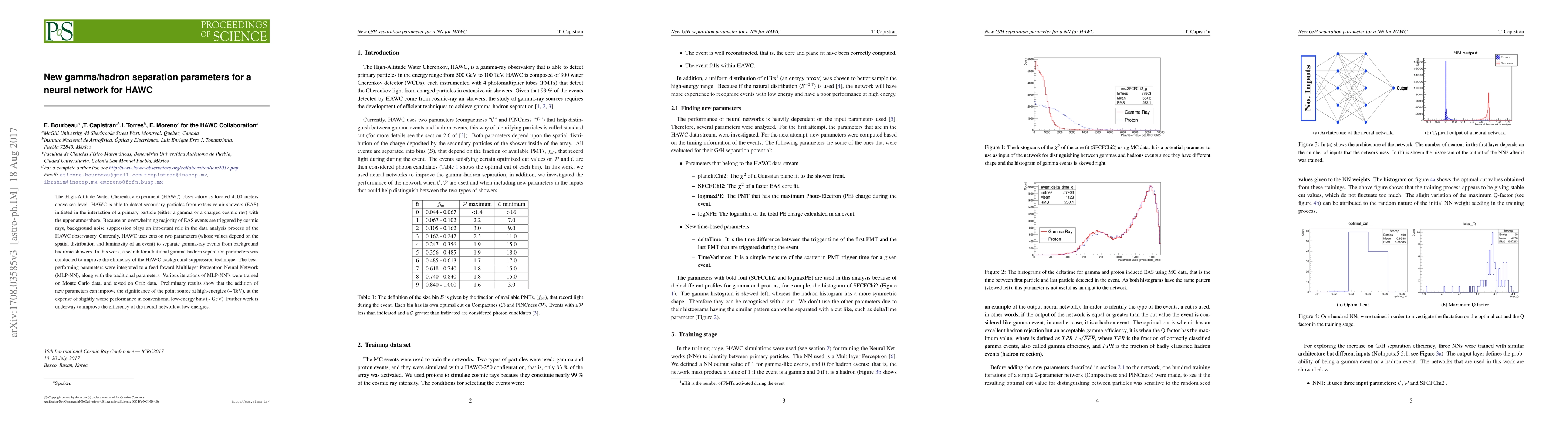 This paper proposes new gamma/hadron separation parameters for enhancing the High-Altitude Water Cherenkov (HAWC) observatory's background suppression technique, integrating them into a Multilayer Perceptron Neural Network (MLP-NN). Preliminary results indicate improved high-energy point source significance but slightly worse performance in low-energy bins.