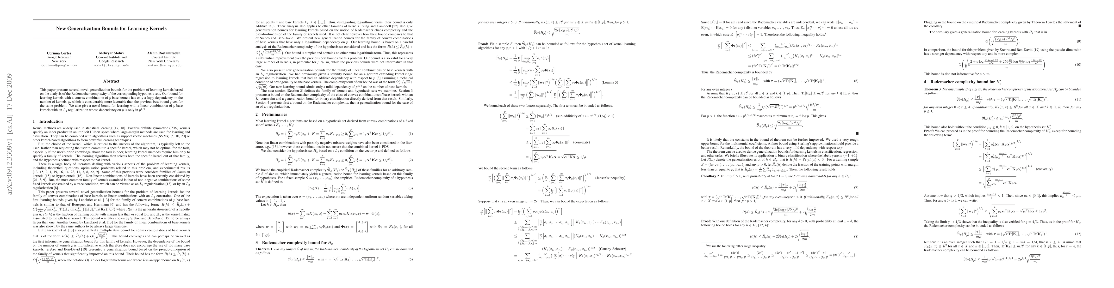 This paper presents several novel generalization bounds for the problem of learning kernels based on the analysis of the Rademacher complexity of the corresponding hypothesis sets. Our bound for learning kernels with a convex combination of p base kernels has only a log(p) dependency on the number of kernels, p, which is considerably more favorable than the previous best bound given for the same problem. We also give a novel bound for learning with a linear combination of p base kernels with an L_2 regularization whose dependency on p is only in p^{1/4}.