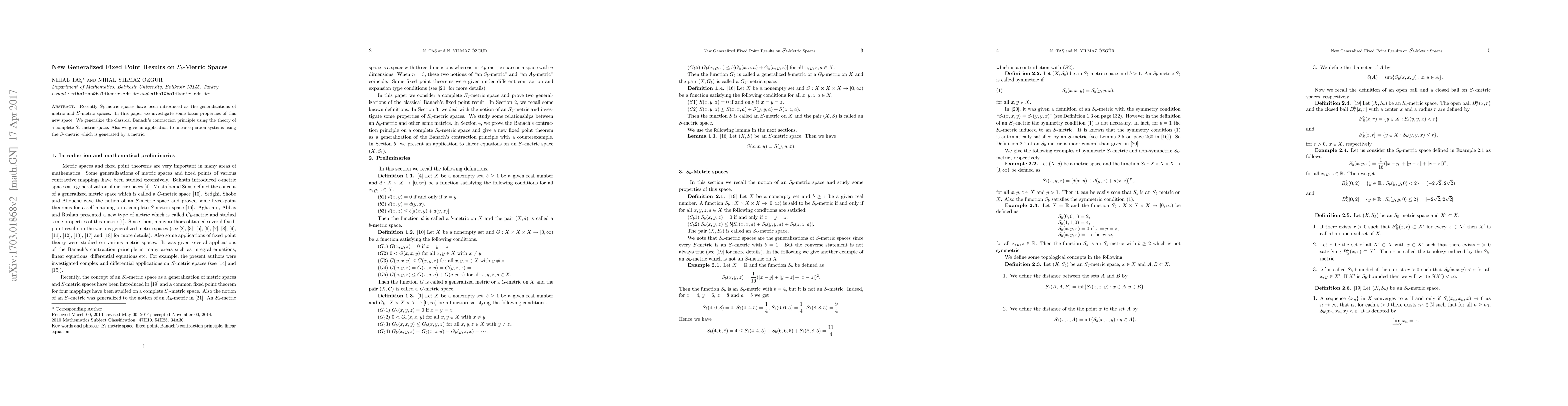 This paper investigates properties of $S_{b}$-metric spaces, generalizing Banach's contraction principle to complete spaces, with applications in linear equation systems.