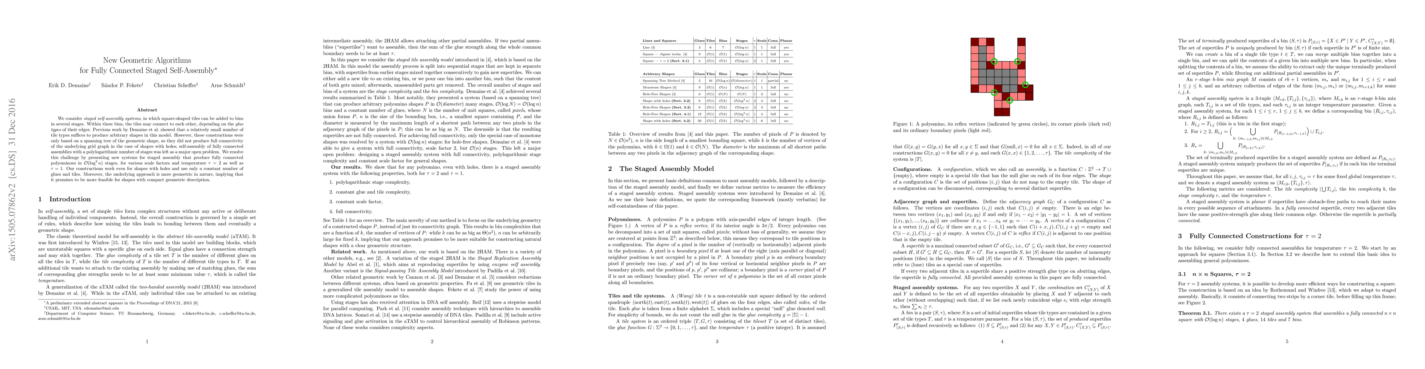 Researchers developed new geometric algorithms to assemble square-shaped tiles into fully connected polyominoes in a staged self-assembly system, achieving this in O(log^2 n) stages with various scale factors and temperatures.