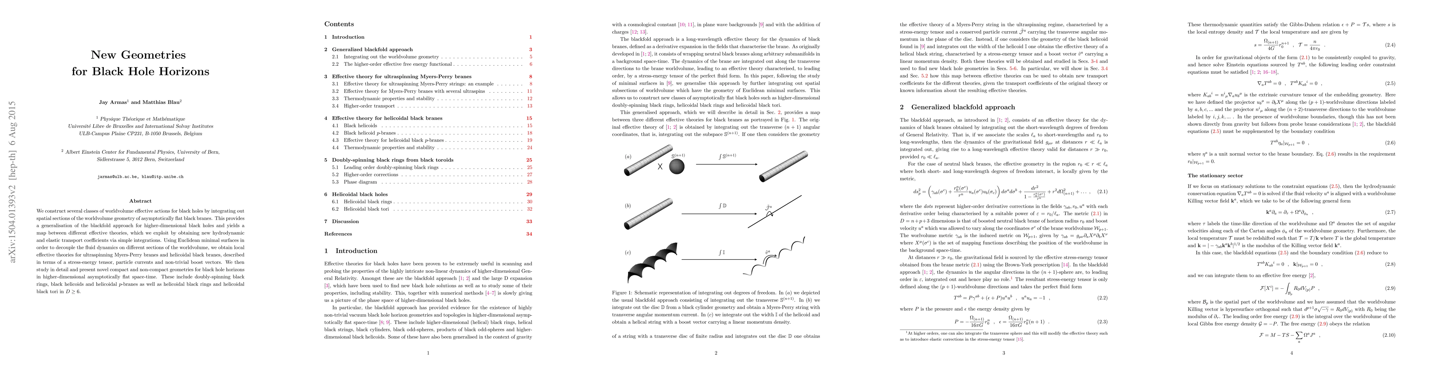 We construct several classes of worldvolume effective actions for black holes by integrating out spatial sections of the worldvolume geometry of asymptotically flat black branes. This provides a generalisation of the blackfold approach for higher-dimensional black holes and yields a map between different effective theories, which we exploit by obtaining new hydrodynamic and elastic transport coefficients via simple integrations. Using Euclidean minimal surfaces in order to decouple the fluid dynamics on different sections of the worldvolume, we obtain local effective theories for ultraspinning Myers-Perry branes and helicoidal black branes, described in terms of a stress-energy tensor, particle currents and non-trivial boost vectors. We then study in detail and present novel compact and non-compact geometries for black hole horizons in higher-dimensional asymptotically flat space-time. These include doubly-spinning black rings, black helicoids and helicoidal $p$-branes as well as helicoidal black rings and helicoidal black tori in $D\ge6$.