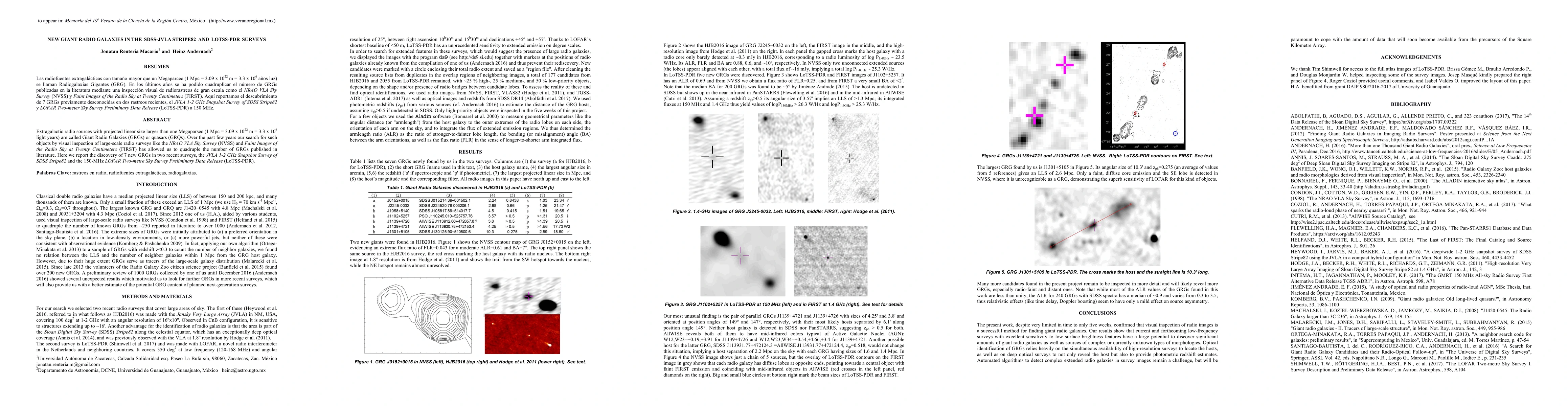 Extragalactic radio sources with projected linear size larger than one Megaparsec 1 Mpc = 3.09e22 m = 3.3e6 light years) are called Giant Radio Galaxies (GRGs) or quasars (GRQs). Over the past few years our search for such objects by visual inspection of large-scale radio surveys like the NRAO VLA Sky Survey (NVSS) and Faint Images of the Radio Sky at Twenty Centimeters (FIRST) has allowed us to quadruple the number of GRGs published in literature. Here we report the discovery of 7 new GRGs in two recent surveys, the JVLA 1-2 GHz Snapshot Survey of SDSS Stripe82 and the 150-MHz LOFAR Two-metre Sky Survey Preliminary Data Release (LoTSS-PDR).