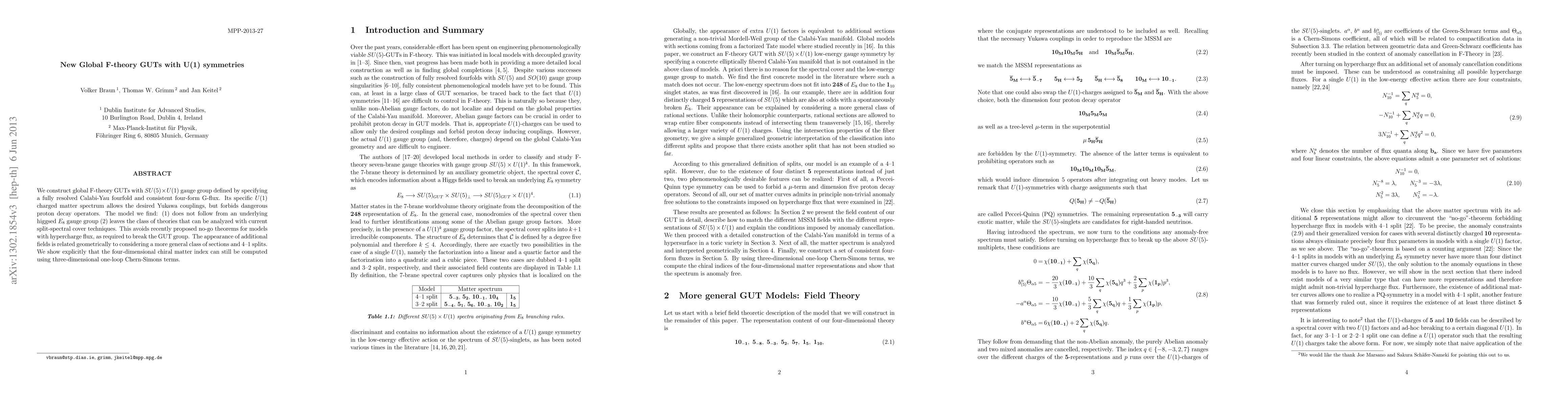 We construct global F-theory GUTs with SU(5) x U(1) gauge group defined by specifying a fully resolved Calabi-Yau fourfold and consistent four-form G-flux. Its specific U(1) charged matter spectrum allows the desired Yukawa couplings, but forbids dangerous proton decay operators. The model we find: (1) does not follow from an underlying higgsed E8 gauge group (2) leaves the class of theories that can be analyzed with current split-spectral cover techniques. This avoids recently proposed no-go theorems for models with hypercharge flux, as required to break the GUT group. The appearance of additional fields is related geometrically to considering a more general class of sections and 4-1 splits. We show explicitly that the four-dimensional chiral matter index can still be computed using three-dimensional one-loop Chern-Simons terms.