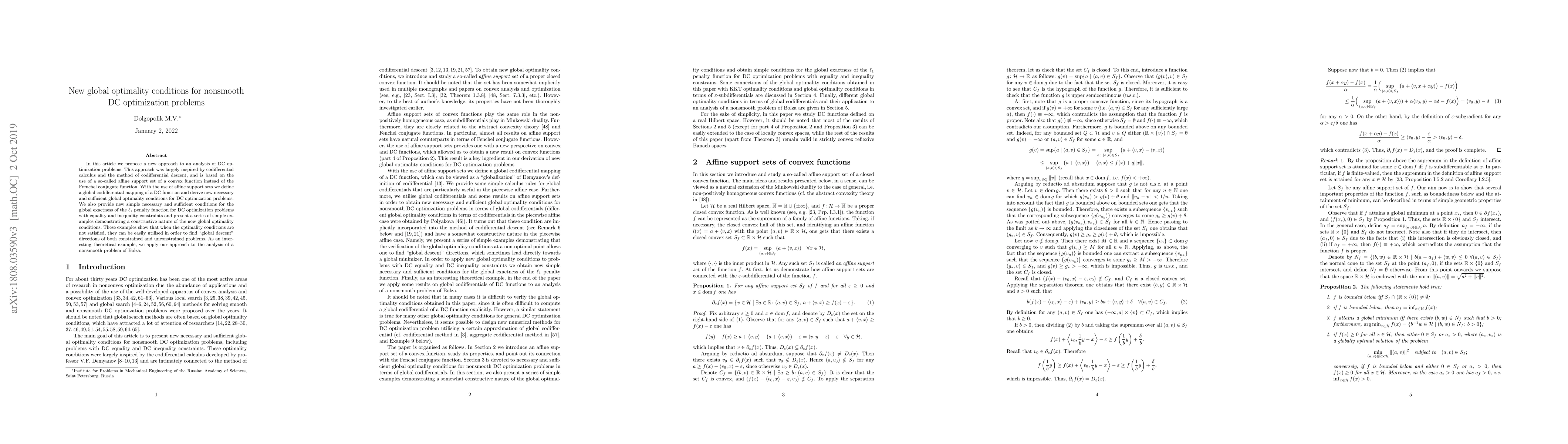 This paper introduces a novel analysis method for nonsmooth DC optimization problems using affine support sets instead of the Frenchel conjugate. It derives new global optimality conditions, provides necessary and sufficient exactness conditions for the $\ell_1$ penalty function, and demonstrates the practical application of these conditions through examples and a theoretical analysis of a nonsmooth Bolza problem.