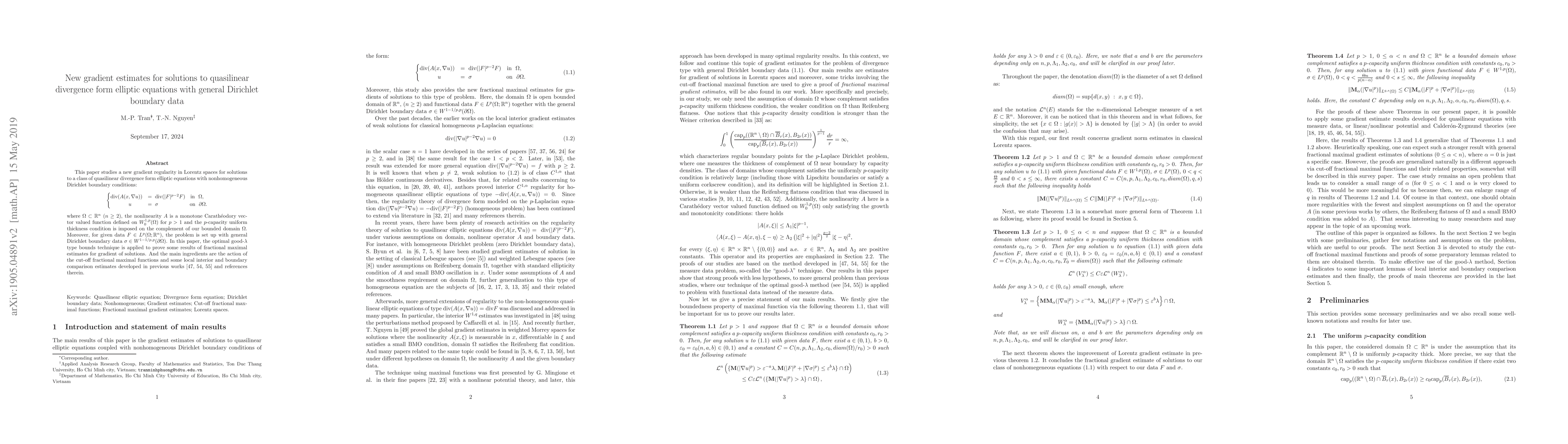 This paper establishes new gradient regularity estimates for solutions to quasilinear divergence form elliptic equations with general Dirichlet boundary data, utilizing optimal good-$\lambda$ type bounds and advanced techniques from previous works to derive fractional maximal estimates for the gradient in Lorentz spaces.