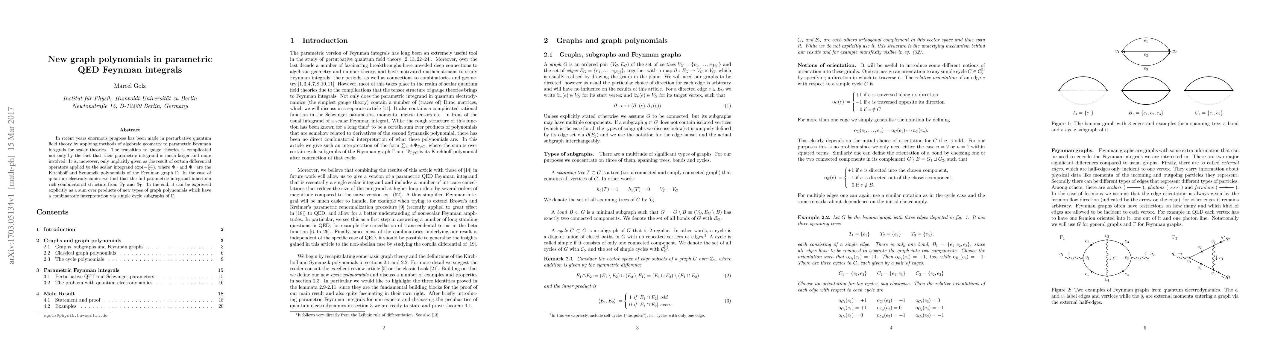 This paper introduces new graph polynomials to represent parametric Feynman integrals in quantum electrodynamics (QED), leveraging algebraic geometry. These graph polynomials are derived from the combinatorial structure of the Kirchhoff and Symanzik polynomials, and are interpreted through simple cycle subgraphs.