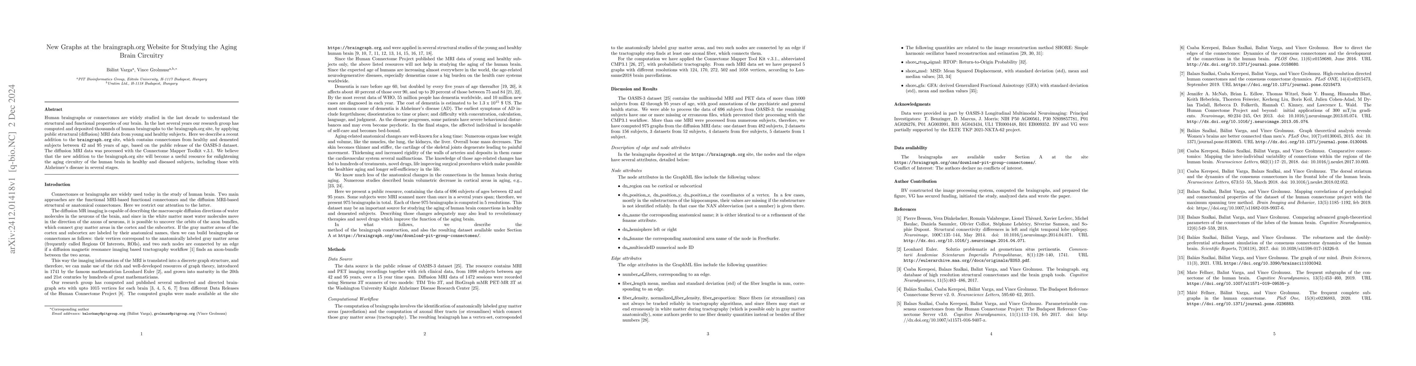 The braingraph.org website has added new connectomes from the OASIS-3 dataset, encompassing healthy and demented subjects aged 42-95 years. These advanced braingraphs, derived from diffusion MRI data, are expected to significantly aid research on aging brain circuitry, especially in Alzheimer's disease.