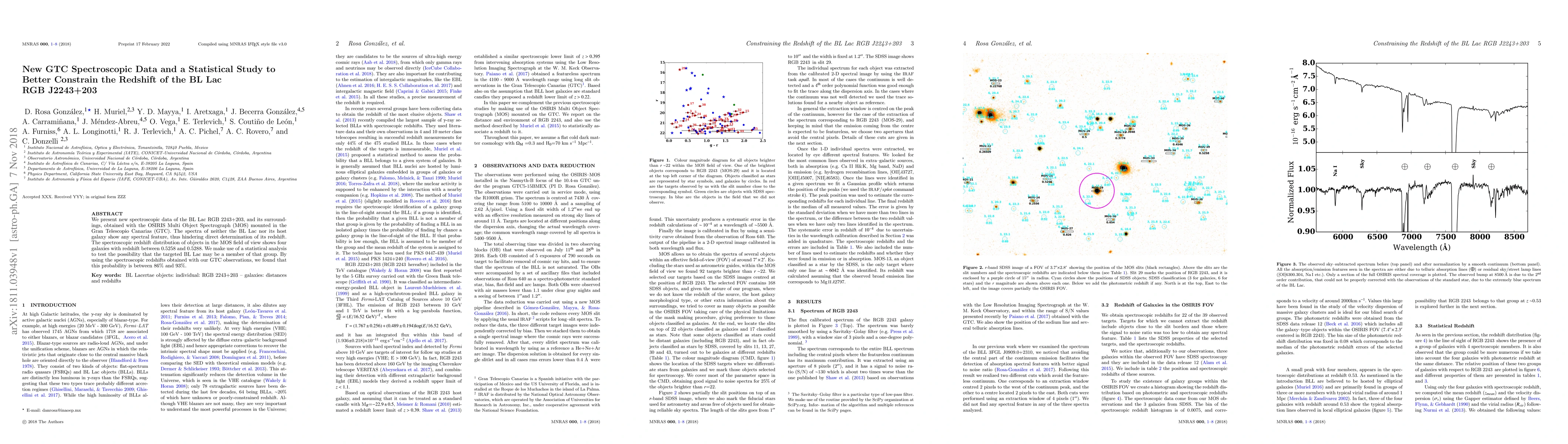 We present new spectroscopic data of the BL Lac RGB 2243+203, and its surroundings, obtained with the OSIRIS Multi Object Spectrograph (MOS) mounted in the Gran Telescopio Canarias (GTC). The spectra of neither the BL Lac nor its host galaxy show any spectral feature, thus hindering direct determination of its redshift. The spectroscopic redshift distribution of objects in the MOS field of view shows four galaxies with redshift between 0.5258 and 0.5288. We make use of a statistical analysis to test the possibility that the targeted BL Lac may be a member of that group. By using the spectroscopic redshifts obtained with our GTC observations, we found that this probability is between 86% and 93%.