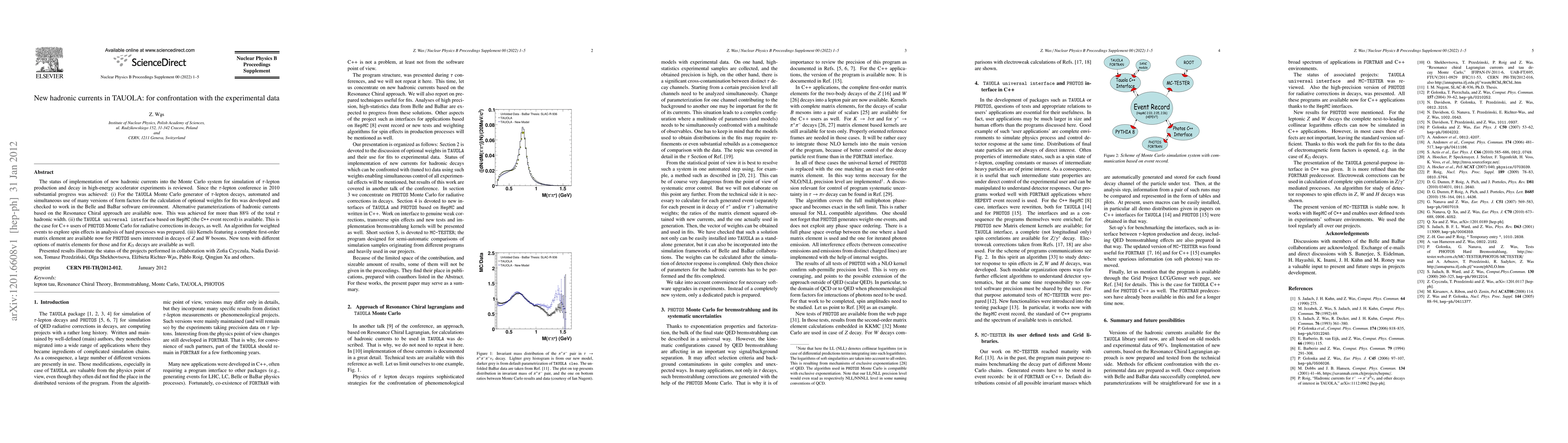 The status of implementation of new hadronic currents into the Monte Carlo system for simulation of tau-lepton production and decay in high-energy accelerator experiments is reviewed. Since the tau-lepton conference in 2010 substantial progress was achieved: (i) For the TAUOLA Monte Carlo generator of tau-lepton decays, automated and simultaneous use of many versions of form factors for the calculation of optional weights for fits was developed and checked to work in the Belle and BaBar software environment. Alternative parameterizations of hadronic currents based on the Resonance Chiral approach are available now. This was achieved for more than 88% of the total tau hadronic width. (ii) the TAUOLA universal interface based on HepMC (the C++ event record) is available. This is the case for C++ users of PHOTOS Monte Carlo for radiative corrections in decays, as well. An algorithm for weighted events to explore spin effects in analysis of hard processes was prepared. (iii) Kernels featuring a complete first-order matrix element are available now for PHOTOS users interested in decays of Z and W bosons. New tests with different options of matrix elements for those and for Kl3 decays are available as well. Presented results illustrate the status of the projects performed in collaboration with Zofia Czyczula, Nadia Davidson, Tomasz Przedzinski, Olga Shekhovtsova, Elzbieta Richter-Was, Pablo Roig, Qingjun Xu and others.