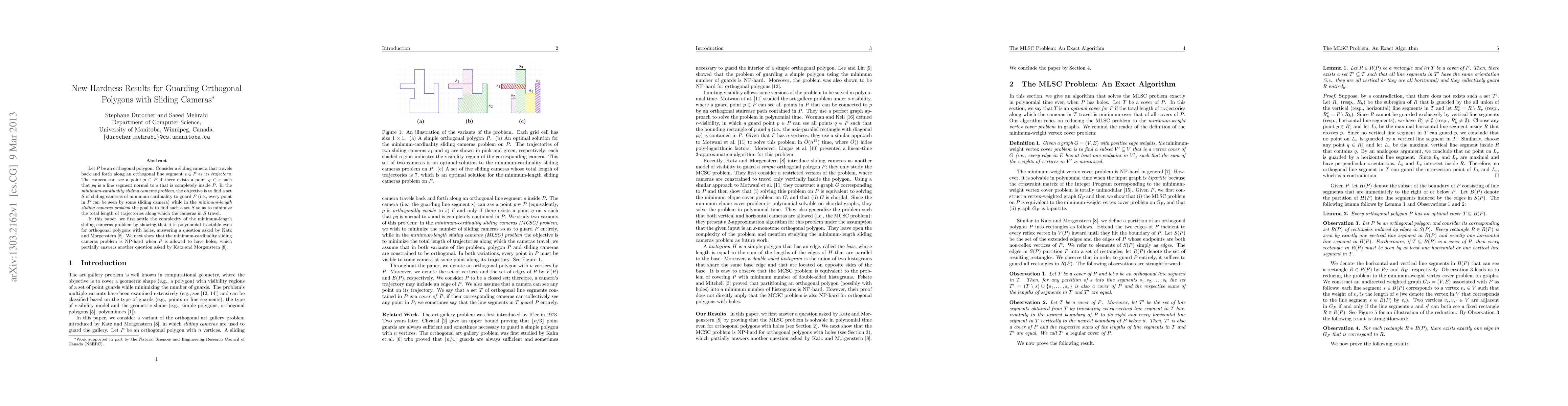 This paper addresses the complexity of guarding orthogonal polygons with sliding cameras. It proves the minimum-length sliding cameras problem is polynomially solvable, even for polygons with holes. It also establishes the minimum-cardinality sliding cameras problem as \textsc{NP}-hard for polygons with holes.