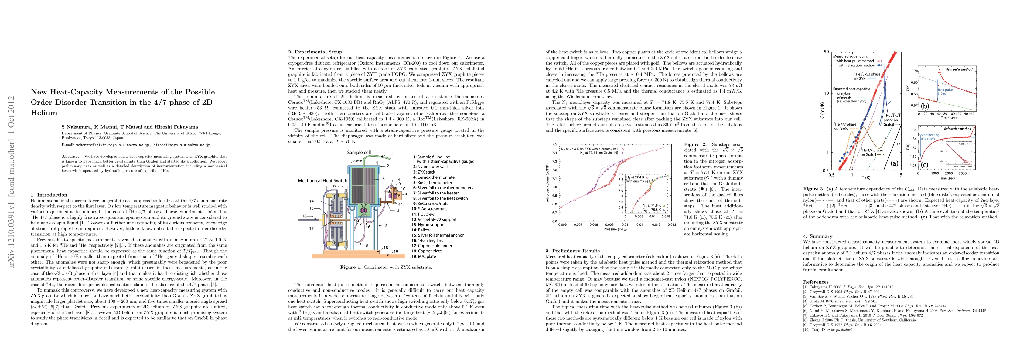 This study introduces a new heat-capacity measurement system using ZYX graphite for better crystallinity, focusing on the 4/7-phase of 2D helium to investigate potential order-disorder transitions. The system includes a mechanical heat-switch activated by superfluid helium-4, providing preliminary data on the phase transition.