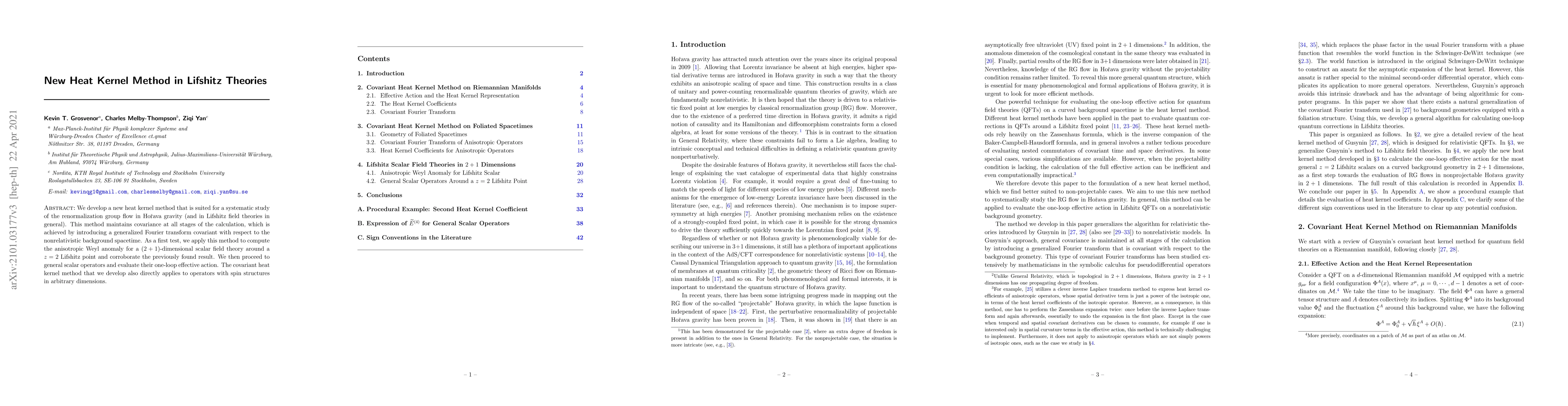 Researchers develop a new heat kernel method for studying Lifshitz theories, ensuring covariance at all stages of calculation, and apply it to compute one-loop effective actions for scalar field theories and operators with spin structures.