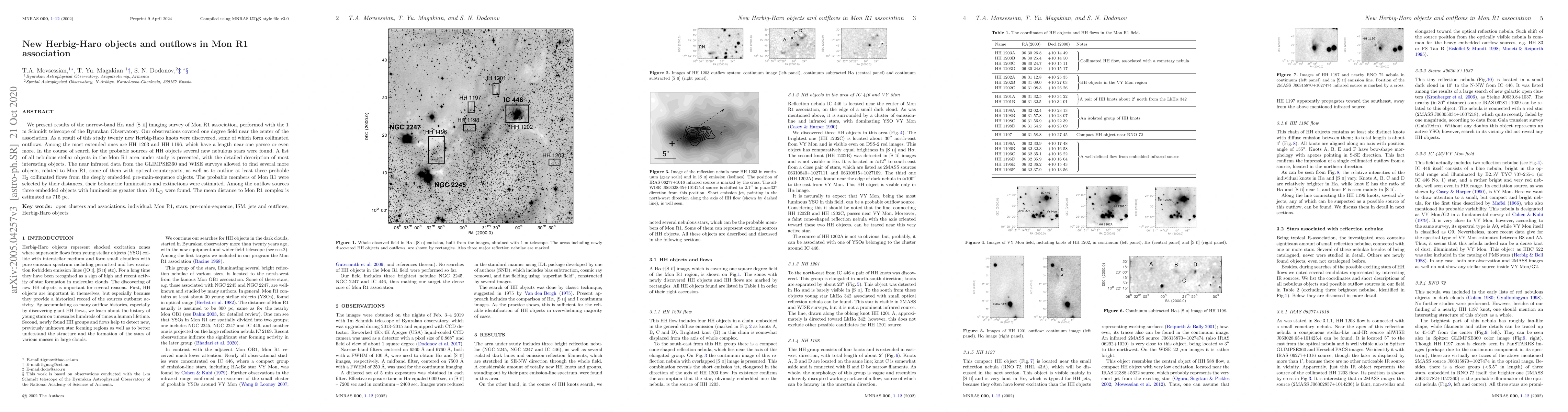 This study discovered twenty new Herbig-Haro objects and outflows in the Mon R1 association using Halpha and [SII] imaging, identifying HH 1203 and HH 1196 as particularly extended. The research also found several new nebulous stars, and estimated the mean distance to Mon R1 as 715 pc.
