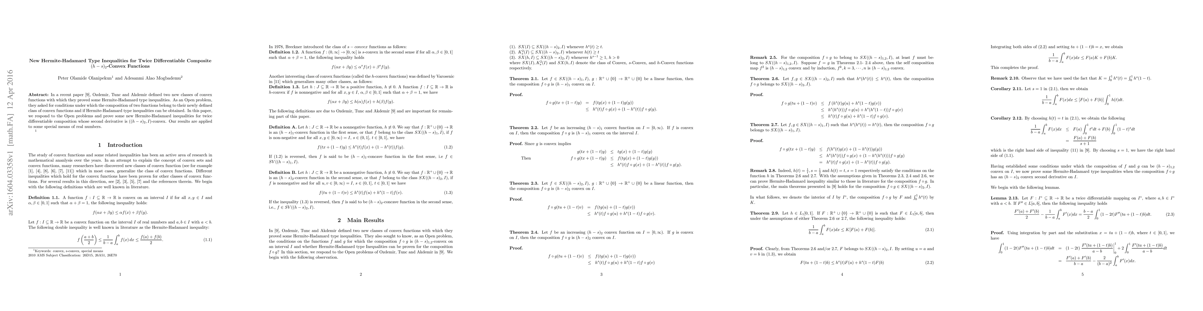 In a recent paper [9], Ozdemir, Tunc and Akdemir defined two new classes of convex functions with which they proved some Hermite-Hadamard type inequalities. As an Open problem, they asked for conditions under which the composition of two functions belong to their newly defined class of convex functions and if Hermite-Hadamard type inequalities can be obtained. In this paper, we respond to the Open problems and prove some new Hermite-Hadamard inequalities for twice differentiable composition whose second derivative is $((h-s)_{2}, I)$-convex. Our results are applied to some special means of real numbers.