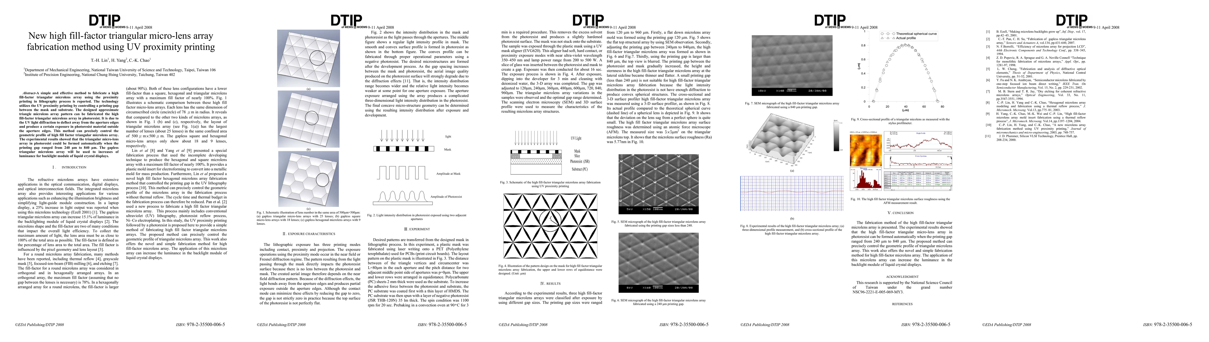 A simple and effective method to fabricate a high fill-factor triangular microlens array using the proximity printing in lithography process is reported. The technology utilizes the UV proximity printing by controlling a printing gap between the mask and substrate. The designed approximate triangle microlens array pattern can be fabricated the high fill-factor triangular microlens array in photoresist. It is due to the UV light diffraction to deflect away from the aperture edges and produce a certain exposure in photoresist material outside the aperture edges. This method can precisely control the geometric profile of high fill factor triangular microlens array. The experimental results showed that the triangular micro-lens array in photoresist could be formed automatically when the printing gap ranged from 240 micrometers to 840 micrometers. The gapless triangular microlens array will be used to increases of luminance for backlight module of liquid crystal displays.