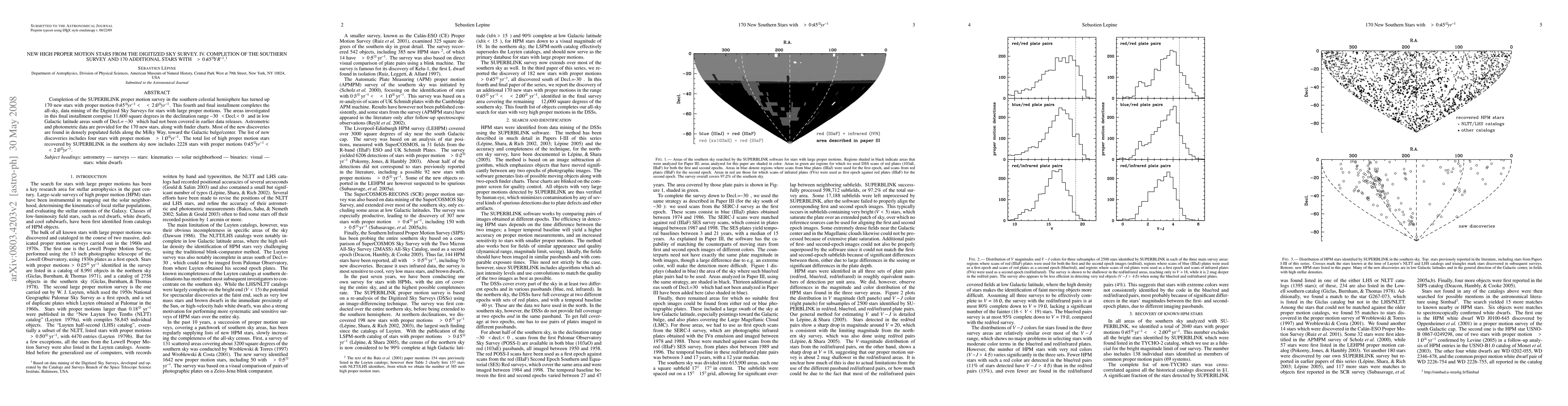 Completion of the SUPERBLINK proper motion survey in the southern celestial hemisphere has turned up 170 new stars with proper motion 0.45 arcsec/yr < pm < 2.0 arcsec/yr. This fourth and final installment completes the all-sky, data-mining of the Digitized Sky Surveys for stars with large proper motions. The areas investigated in this final installment comprise 11,600 square degrees in the declination range -30 degrees < Decl. <0 degrees, and in low galactic latitude areas south of Decl.= -30 degrees which had not been covered in earlier data releases. Astrometric and photometric data are provided for the 170 new stars, along with finder charts. Most of the new discoveries are found in densely populated fields along the Milky Way, towards the Galactic bulge/center. The list of new discoveries includes 4 stars with proper motion pm >1.0 arcsec/yr. The total list of high proper motion stars recovered by SUPERBLINK in the southern sky now includes 2,228 stars with proper motions 0.45 arcsec/yr < pm <2.0 arcsec/yr.