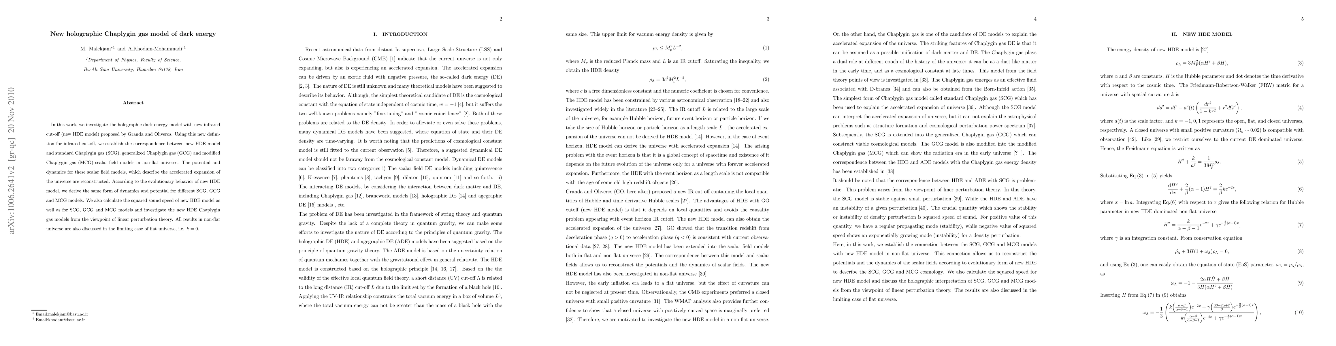 This paper explores a new holographic dark energy model with an innovative infrared cut-off, establishing connections between it and various Chaplygin gas models in a non-flat universe. It reconstructs the dynamics and potentials for these models and investigates their behavior under linear perturbation theory.