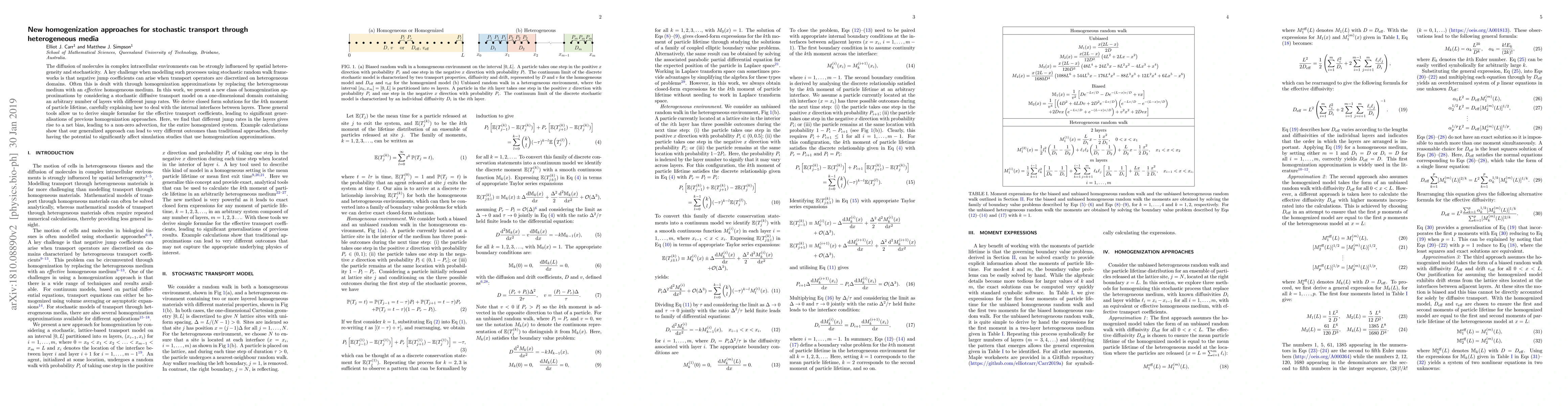 The diffusion of molecules in complex intracellular environments can be strongly influenced by spatial heterogeneity and stochasticity. A key challenge when modelling such processes using stochastic random walk frameworks is that negative jump coefficients can arise when transport operators are discretized on heterogeneous domains. Often this is dealt with through homogenization approximations by replacing the heterogeneous medium with an $\textit{effective}$ homogeneous medium. In this work, we present a new class of homogenization approximations by considering a stochastic diffusive transport model on a one-dimensional domain containing an arbitrary number of layers with different jump rates. We derive closed form solutions for the $k$th moment of particle lifetime, carefully explaining how to deal with the internal interfaces between layers. These general tools allow us to derive simple formulae for the effective transport coefficients, leading to significant generalisations of previous homogenization approaches. Here, we find that different jump rates in the layers gives rise to a net bias, leading to a non-zero advection, for the entire homogenized system. Example calculations show that our generalized approach can lead to very different outcomes than traditional approaches, thereby having the potential to significantly affect simulation studies that use homogenization approximations.
